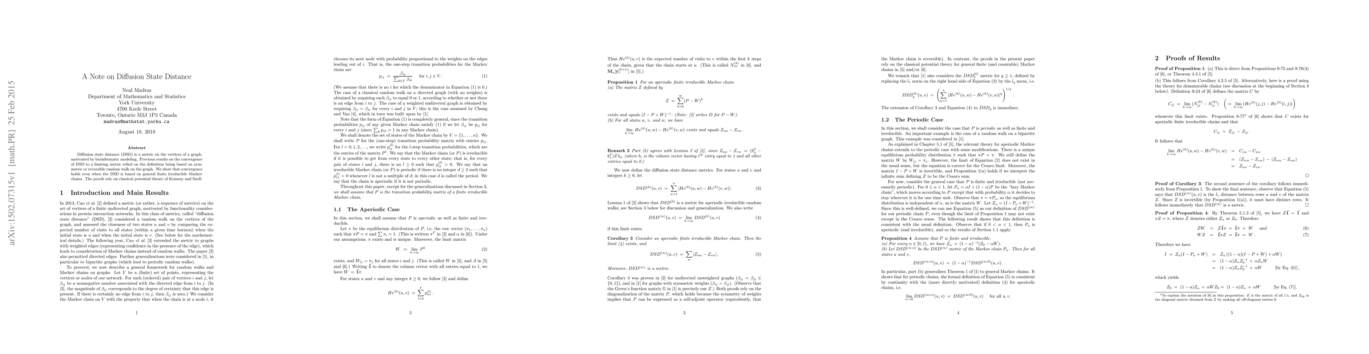 Diffusion state distance (DSD) is a metric on the vertices of a graph, motivated by bioinformatic modeling. Previous results on the convergence of DSD to a limiting metric relied on the definition being based on symmetric or reversible random walk on the graph. We show that convergence holds even when the DSD is based on general finite irreducible Markov chains. The proofs rely on classical potential theory of Kemeny and Snell.