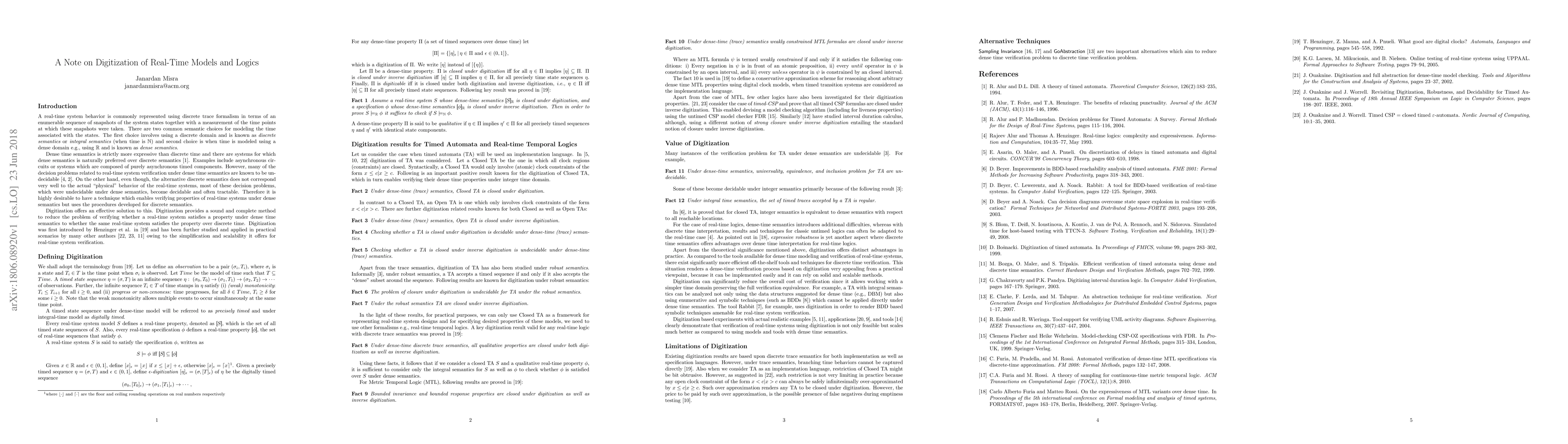 Digitization provides a sound and complete method to reduce the problem of verifying whether a real-time system satisfies a property under dense-time semantics to whether the same real-time system satisfies the property over discrete-time. This is a brief overview of digitization of real-time models and logics covering known results, value, limitations, and alternatives.