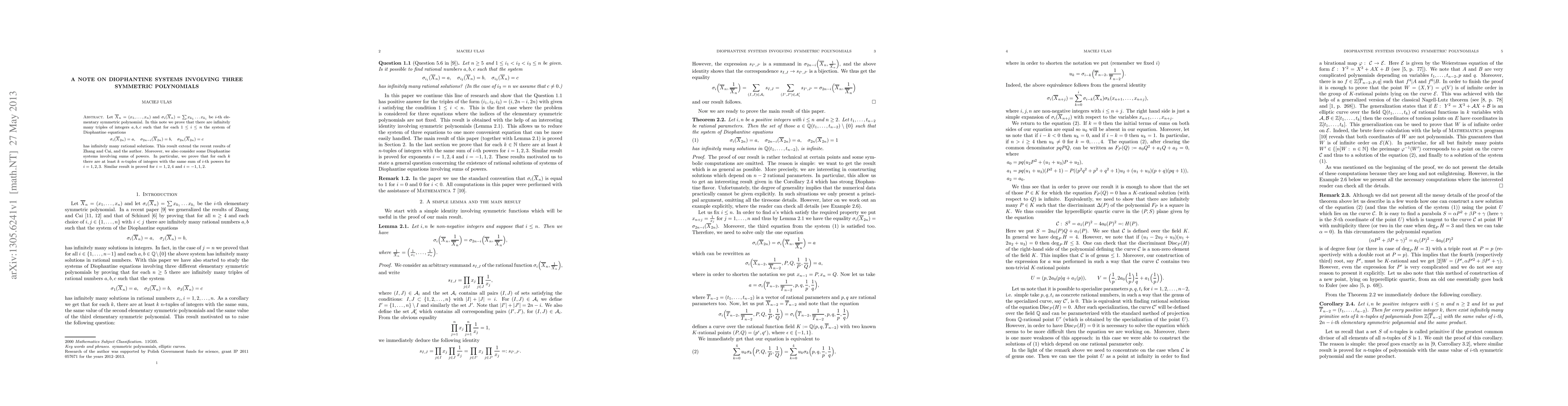 This paper proves the existence of infinitely many triples of integers that satisfy a Diophantine system involving symmetric polynomials, extending previous results. It also demonstrates that for any integer $k$, there exist at least $k$ $n$-tuples of integers with the same sum of $i$-th powers for specified $i$.