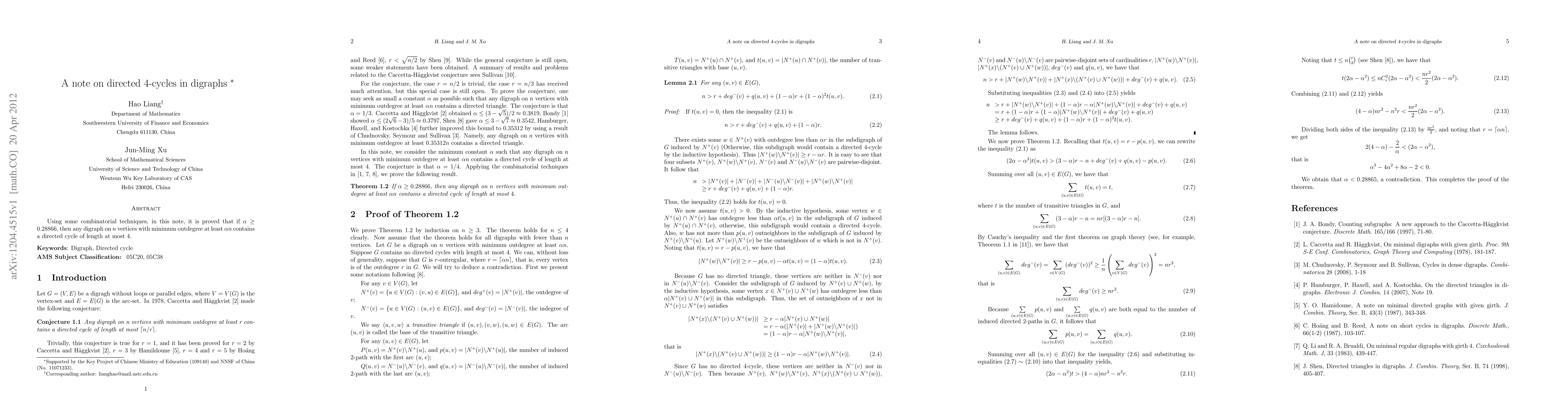 Summary: This paper proves that for any digraph with minimum outdegree at least 0.28866 times the number of vertices, there exists a directed cycle of length 4 or less using combinatorial techniques. The result highlights the presence of short cycles in highly connected directed graphs.