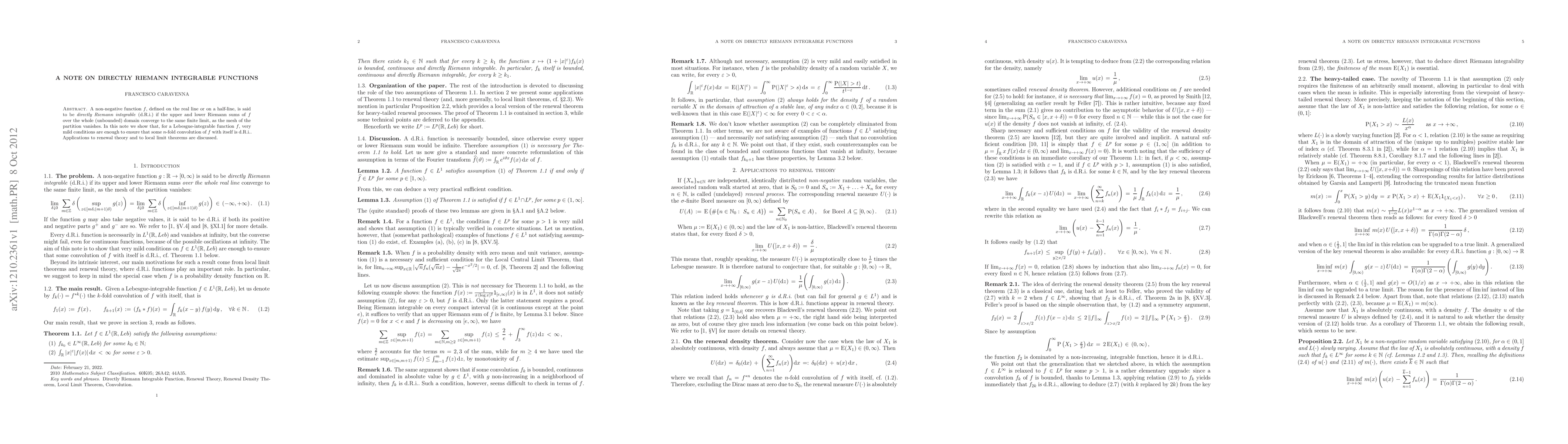 A non-negative function f, defined on the real line or on a half-line, is said to be directly Riemann integrable (d.R.i.) if the upper and lower Riemann sums of f over the whole (unbounded) domain converge to the same finite limit, as the mesh of the partition vanishes. In this note we show that, for a Lebesgue-integrable function f, very mild conditions are enough to ensure that some n-fold convolution of f with itself is d.R.i.. Applications to renewal theory and to local limit theorems are discussed.