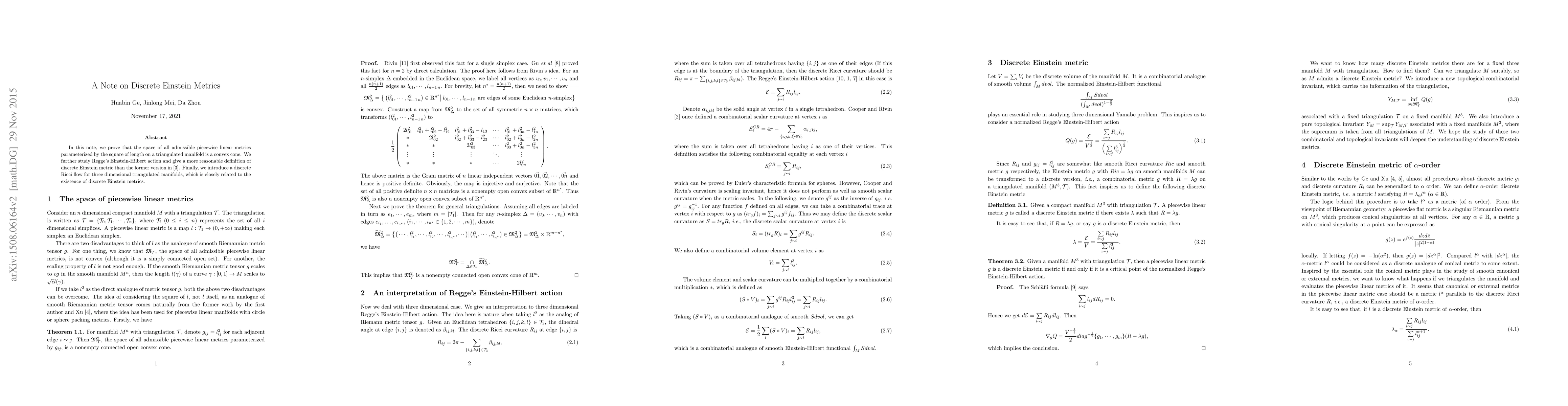 In this short note, we prove that the space of all admissible piecewise linear metrics parameterized by length square on a triangulated manifolds is a convex cone. We further study Regge's Einstein-Hilbert action and give a much more reasonable definition of discrete Einstein metric than our former version in \cite{G}. Finally, we introduce a discrete Ricci flow for three dimensional triangulated manifolds, which is closely related to the existence of discrete Einstein metrics.