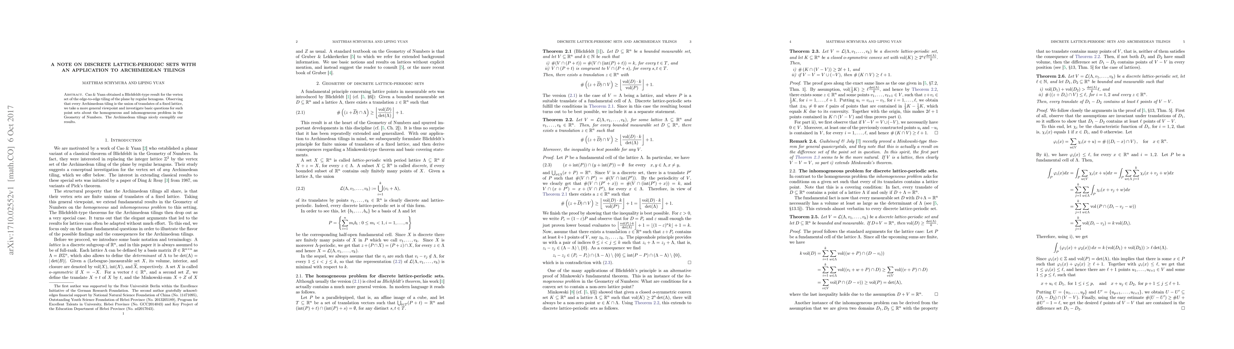 Cao & Yuan obtained a Blichfeldt-type result for the vertex set of the edge-to-edge tiling of the plane by regular hexagons. Observing that every Archimedean tiling is the union of translates of a fixed lattice, we take a more general viewpoint and investigate basic questions for such point sets about the homogeneous and inhomogeneous problem in the Geometry of Numbers. The Archimedean tilings nicely exemplify our results.