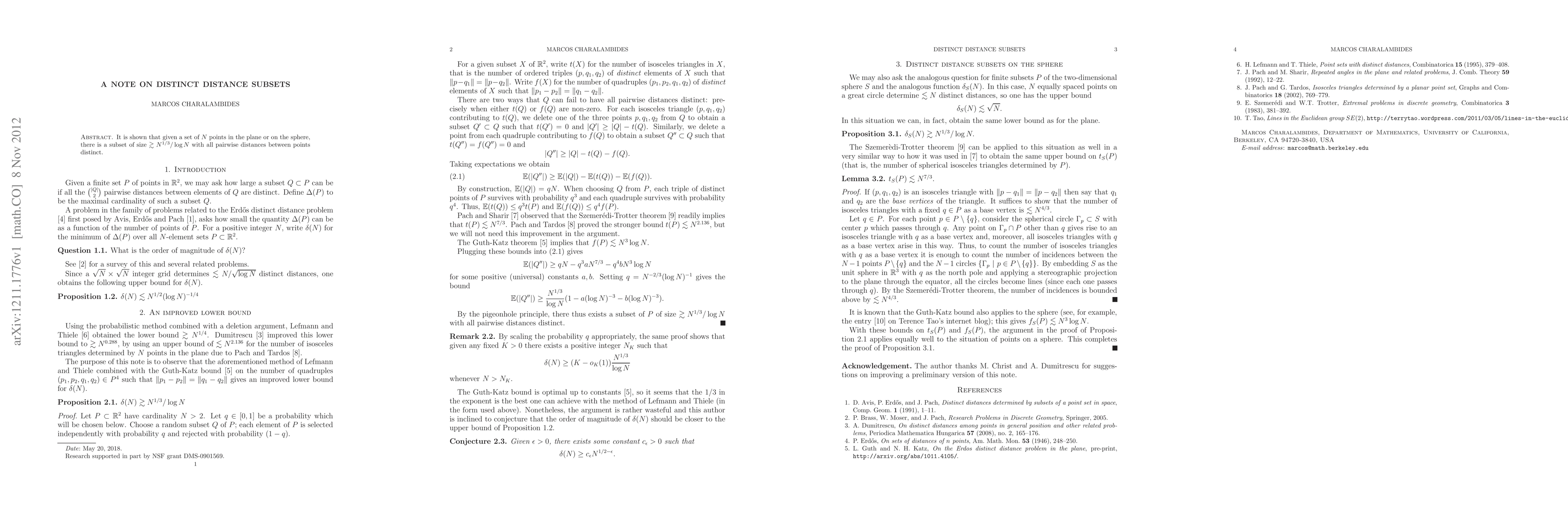 It is shown that given a set of $N$ points in the plane or on the sphere, there is a subset of size $\gtrsim N^{1/3}/\log N$ with all pairwise distances between points distinct.