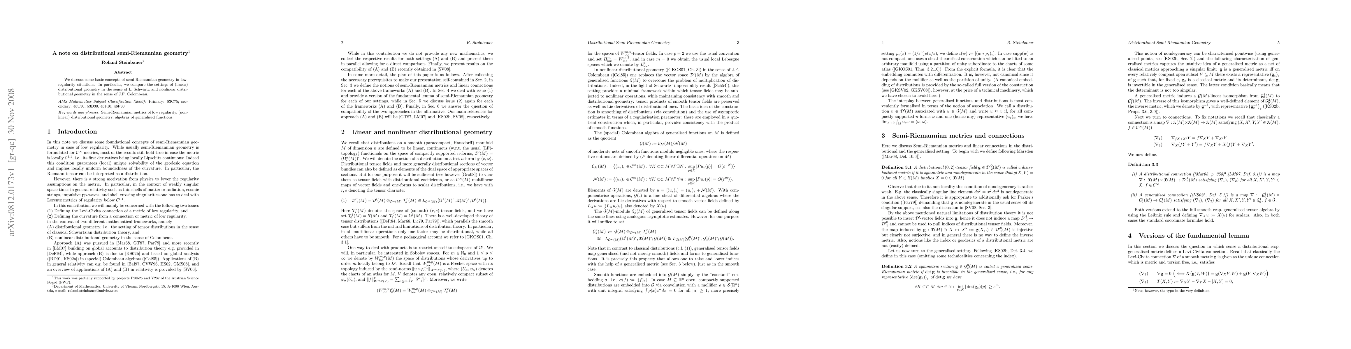 Summary: This paper explores foundational ideas in semi-Riemannian geometry under low-regularity conditions, comparing linear distributional geometry by Schwartz with nonlinear distributional geometry by Colombeau. The focus is on the theoretical frameworks and their implications in mathematical analysis.