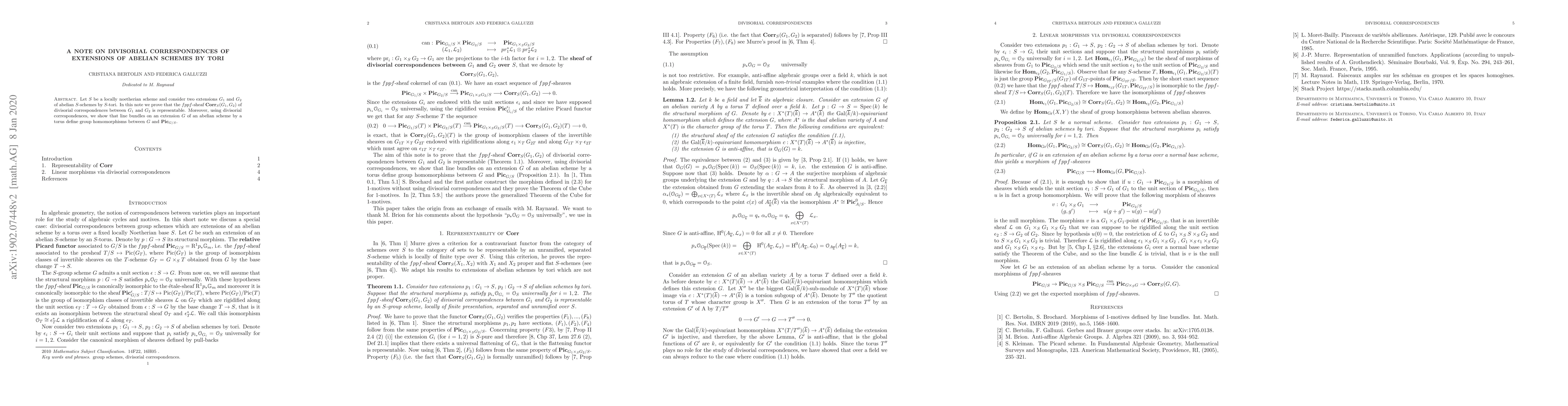 Let S be a locally noetherian scheme and consider two extensions G_1 and G_2 of abelian S-schemes by S-tori. In this note we prove that the fppf-sheaf Corr _S(G_1,G_2) of divisorial correspondences between G_1 and G_2 is representable. Moreover, using divisorial correspondences, we show that line bundles on an extension G of an abelian scheme by a torus define group homomorphisms between G and Pic_{ G/S}.