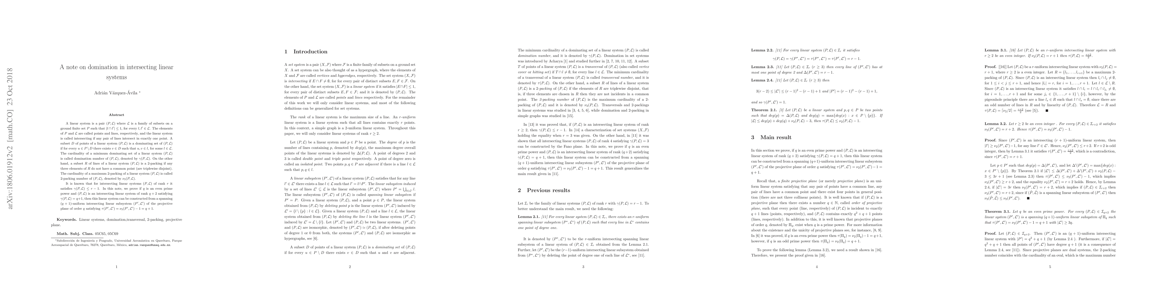 A linear system is a pair $(P,\mathcal{L})$ where $\mathcal{L}$ is a family of subsets on a ground finite set $P$ such that $|l\cap l^\prime|\leq 1$, for every $l,l^\prime \in \mathcal{L}$. The elements of $P$ and $\mathcal{L}$ are called points and lines, respectively, and the linear system is called intersecting if any pair of lines intersect in exactly one point. A subset $D$ of points of a linear system $(P,\mathcal{L})$ is a dominating set of $(P,\mathcal{L})$ if for every $u\in P\setminus D$ there exists $v\in D$ such that $u,v\in l$, for some $l\in\mathcal{L}$. The cardinality of a minimum dominating set of a linear system $(P,\mathcal{L})$ is called domination number of $(P,\mathcal{L})$, denoted by $\gamma(P,\mathcal{L})$. On the other hand, a subset $R$ of lines of a linear system $(P,\mathcal{L})$ is a 2-packing if any three elements of $R$ have not a common point (are triplewise disjoint). The cardinality of a maximum 2-packing of a linear system $(P,\mathcal{L})$ is called 2-packing number of $(P,\mathcal{L})$, denoted by $\nu_2(P,\mathcal{L})$. It is know for intersecting linear systems $(P,\mathcal{L})$ of rank $r$ it satisfies $\gamma(P,\mathcal{L})\leq r-1$. In this note we prove, if $q$ is an even prime power and $(P,\mathcal{L})$ is an intersecting linear system of rank $q+2$ satisfying $\gamma(P,\mathcal{L})=q+1$, then this linear system can be constructed from a spanning $(q+1)$-uniform intersecting linear subsystem $(P^\prime,\mathcal{L}^\prime)$ of the projective plane of order $q$ satisfying $\tau(P^\prime,\mathcal{L}^\prime)=\nu_2(P^\prime,\mathcal{L}^\prime)-1=q+1$.