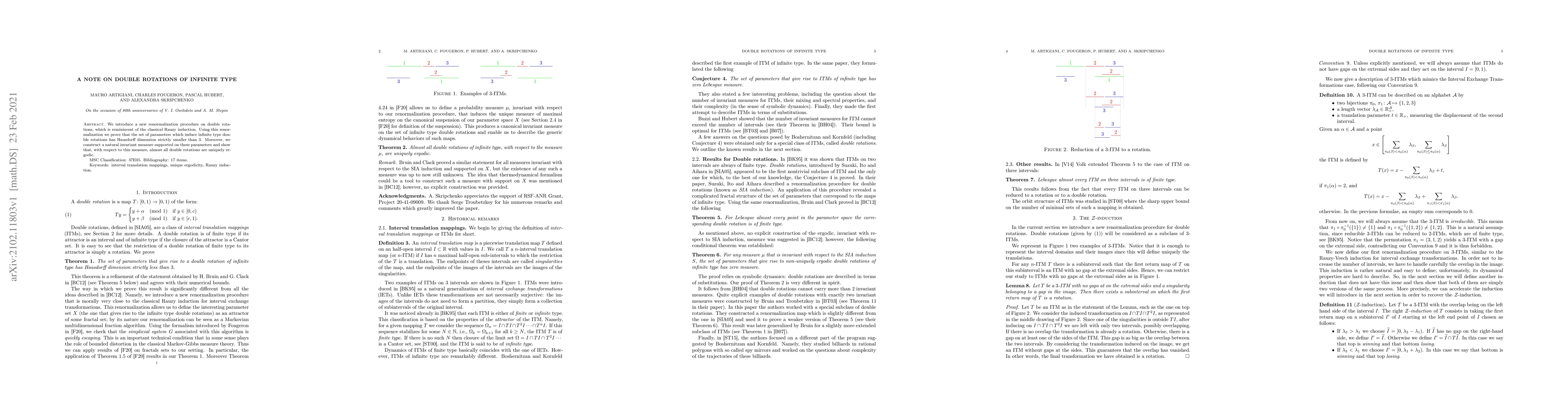 We introduce a new renormalization procedure on double rotations, which is reminiscent of the classical Rauzy induction. Using this renormalization we prove that the set of parameters which induce infinite type double rotations has Hausdorff dimension strictly smaller than 3. Moreover, we construct a natural invariant measure supported on these parameters and show that, with respect to this measure, almost all double rotations are uniquely ergodic.