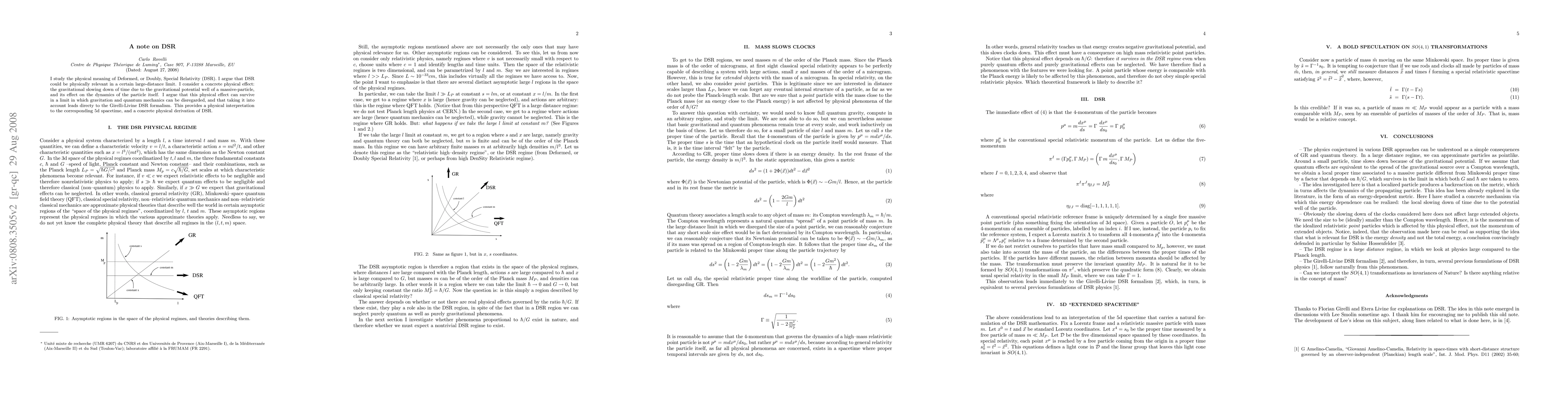 I study the physical meaning of Deformed, or Doubly, Special Relativity (DSR). I argue that DSR could be physically relevant in a certain large-distance limit. I consider a concrete physical effect: the gravitational slowing down of time due to the gravitational potential well of a massive-particle, and its effect on the dynamics of the particle itself. I argue that this physical effect can survive in a limit in which gravitation and quantum mechanics can be disregarded, and that taking it into account leads directy to the Girelli-Livine DSR formalism. This provides a physical interpretation to the corresponding 5d spacetime, and a concrete physical derivation of DSR.