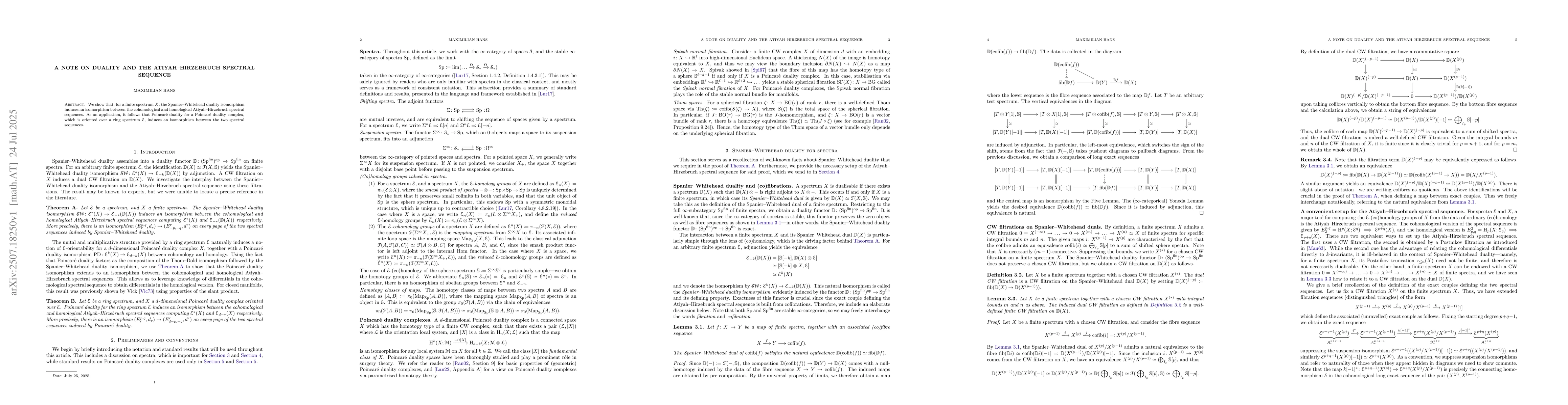 We show that, for a finite spectrum $X$, the Spanier-Whitehead duality isomorphism induces an isomorphism between the cohomological and homological Atiyah-Hirzebruch spectral sequences. As an application, it follows that Poincar\'e duality for a Poincar\'e duality complex, which is oriented over a ring spectrum $E$, induces an isomorphism between the two spectral sequences.