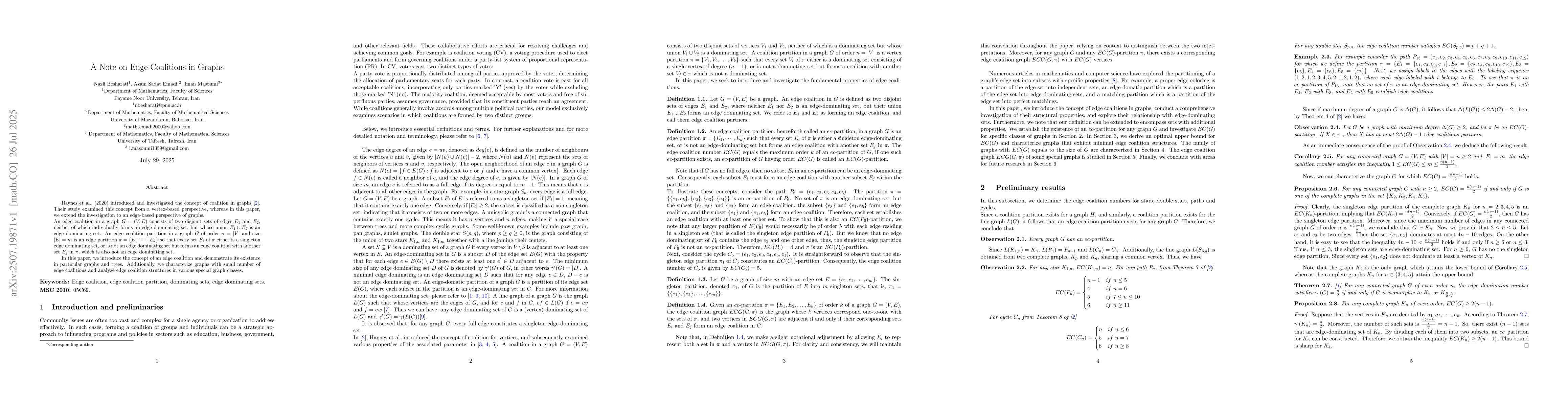 Haynes et al. (2020) introduced and investigated the concept of coalition in graphs \cite{hhhmm1}. Their study examined this concept from a vertex-based perspective, whereas in this paper, we extend the investigation to an edge-based perspective of graphs. \\ An edge coalition in a graph $G=(V,E)$ consists of two disjoint sets of edges $E_1$ and $E_2$, neither of which individually forms an edge dominating set, but whose union $E_1\cup E_2$ is an edge dominating set. An edge coalition partition in a graph $G$ of order $n=|V|$ and size $|E|=m$ is an edge partition $\pi=\{E_1,\cdots,E_k\}$ so that every set $E_i$ of $\pi$ either is a singleton edge dominating set, or is not an edge dominating set but forms an edge coalition with another set $E_j$ in $\pi$, which is also not an edge dominating set. In this paper, we introduce the concept of an edge coalition and demonstrate its existence in particular graphs and trees. Additionally, we characterize graphs with small number of edge coalitions and analyze edge coalition structures in various special graph classes.