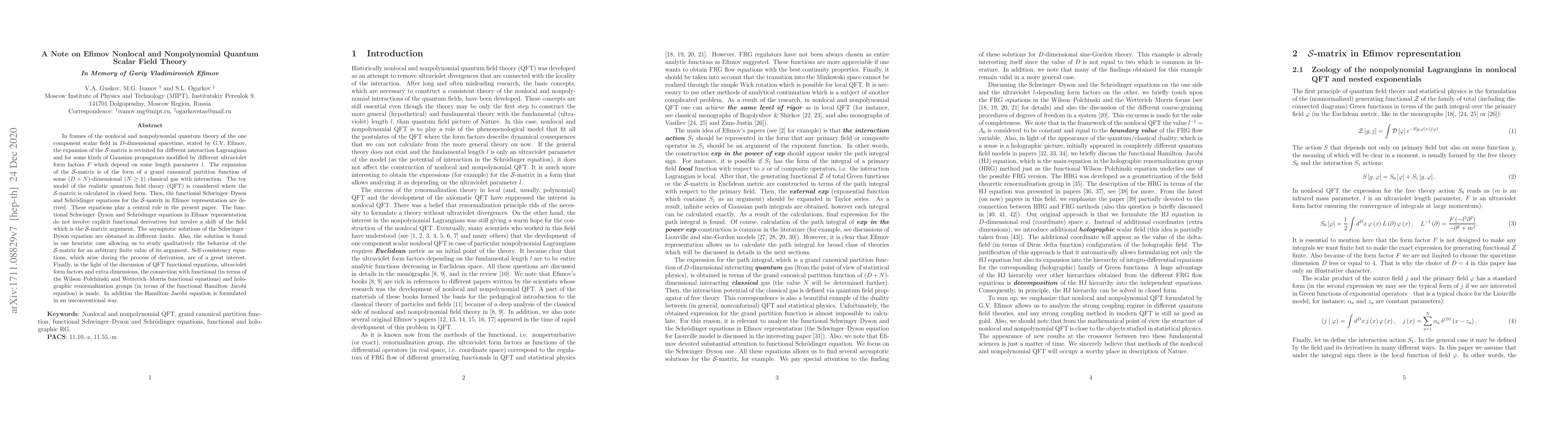 In frames of the nonlocal and nonpolynomial quantum theory of the one component scalar field in $D$-dimensional spacetime, stated by Gariy Vladimirovich Efimov, the expansion of the $\mathcal{S}$-matrix is revisited for different interaction Lagrangians and for some kinds of Gaussian propagators modified by different ultraviolet form factors $F$ which depend on some length parameter $l$. The expansion of the $\mathcal{S}$-matrix is of the form of a grand canonical partition function of some $D+N$-dimensional ($N\geq 1$) classical gas with interaction. The toy model of the realistic quantum field theory (QFT) is considered where the $\mathcal{S}$-matrix is calculated in closed form. Then, the functional Schwinger-Dyson and Schr\"{o}dinger equations for the $\mathcal{S}$-matrix in Efimov representation are derived. These equations play a central role in the present paper. The functional Schwinger-Dyson and Schr\"{o}dinger equations in Efimov representation do not involve explicit functional derivatives but involve a shift of the field which is the $\mathcal{S}$-matrix argument. The asymptotic solutions of the Schwinger-Dyson equation are obtained in different limits. Also, the solution is found in one heuristic case allowing us to study qualitatively the behavior of the $\mathcal{S}$-matrix for an arbitrary finite value of its argument. Self-consistency equations, which arise during the process of derivation, are of a great interest. Finally, in the light of the discussion of QFT functional equations, ultraviolet form factors and extra dimensions, the connection with functional (in terms of the Wilson-Polchinski and Wetterich-Morris functional equations) and holographic renormalization groups (in terms of the functional Hamilton-Jacobi equation) is made. In addition the Hamilton-Jacobi equation is formulated in an unconventional way.