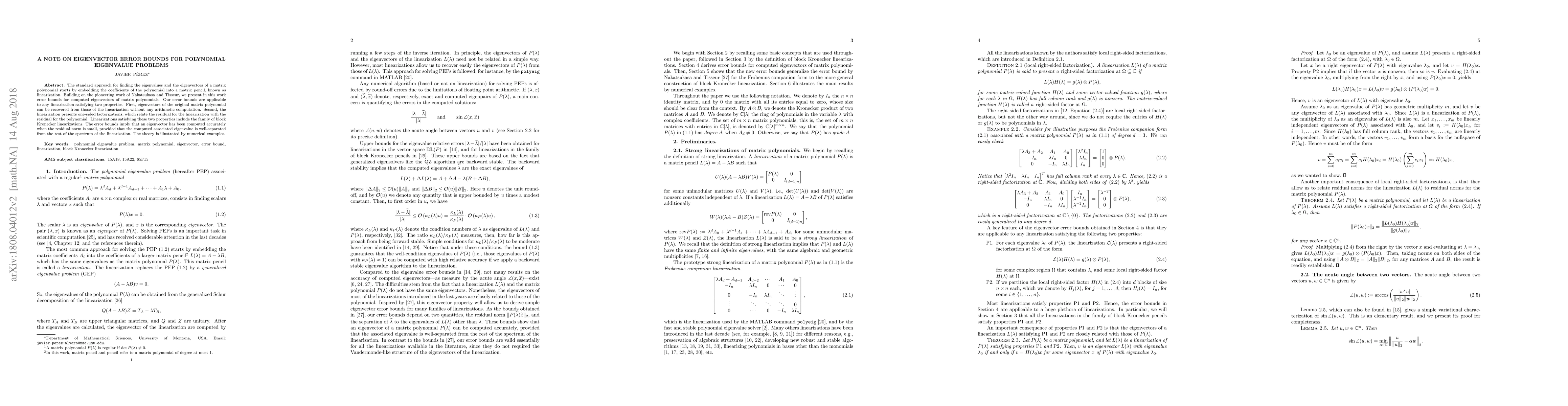 This paper presents error bounds for computed eigenvectors of matrix polynomials, focusing on linearizations that allow recovery of original eigenvectors without additional computations and possess one-sided factorizations. The bounds ensure accurate eigenvector computation when the residual norm is small and the associated eigenvalue is well-separated.