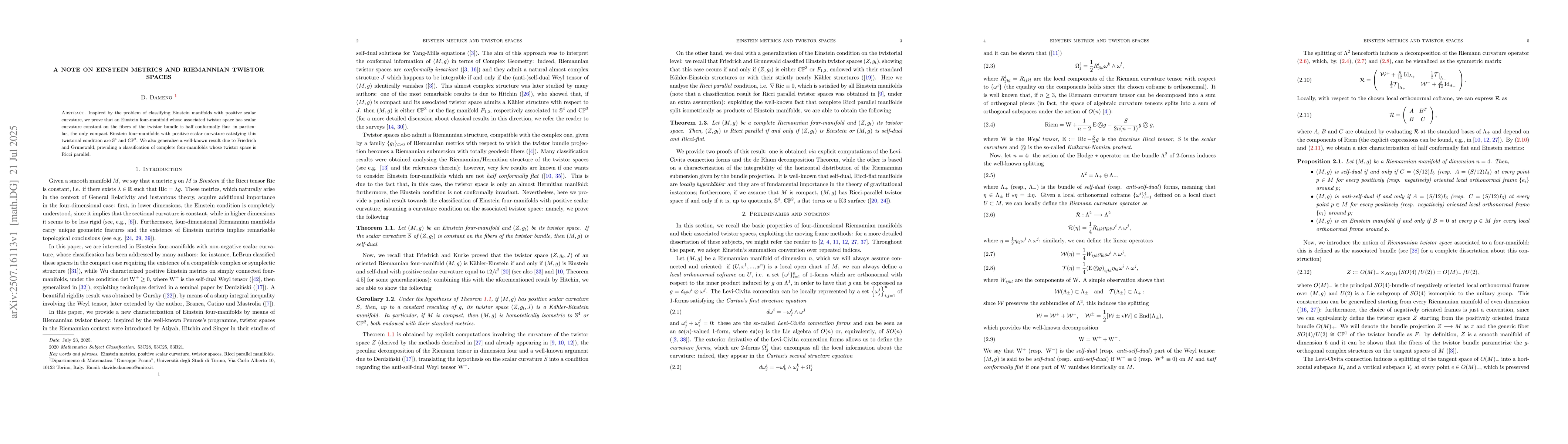 Inspired by the problem of classifying Einstein manifolds with positive scalar curvature, we prove that an Einstein four-manifold whose associated twistor space has scalar curvature constant on the fibers of the twistor bundle is half conformally flat: in particular, the only compact Einstein four-manifolds with positive scalar curvature satisfying this twistorial condition are $\mathbb{S}^4$ and $\mathbb{CP}^2$. We also generalize a well-known result due to Friedrich and Grunewald, providing a classification of complete four-manifolds whose twistor space is Ricci parallel.