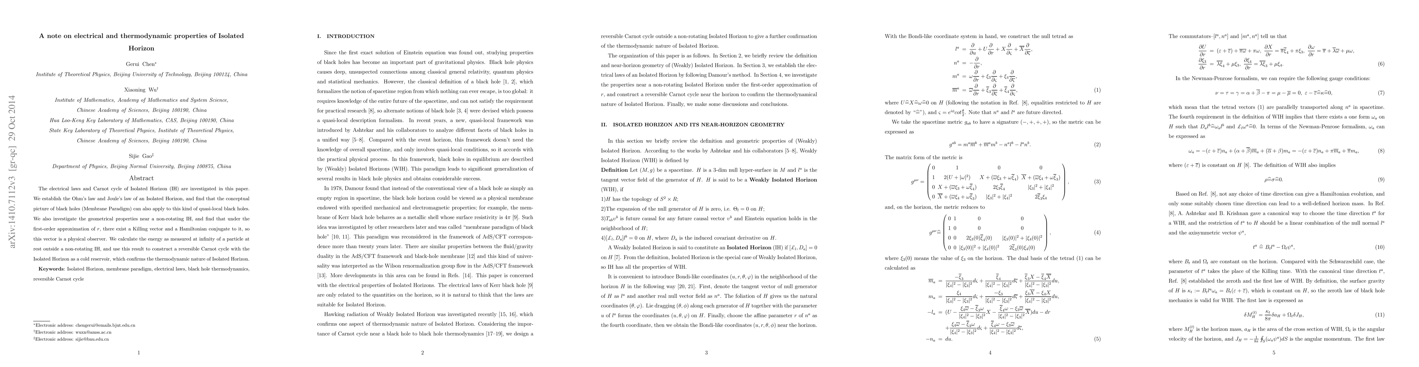 This paper investigates the electrical and thermodynamic properties of Isolated Horizons (IH), establishing Ohm's and Joule's laws for IH and confirming the thermodynamic nature through a reversible Carnot cycle, while also demonstrating the applicability of the Membrane Paradigm to quasi-local black holes.