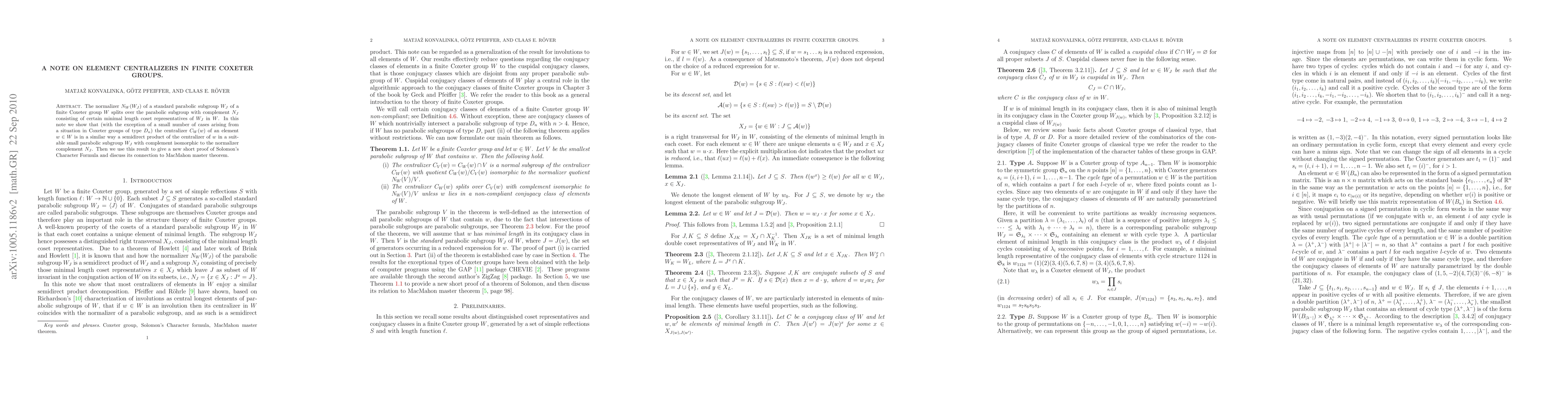 This paper demonstrates that the centralizer $C_W(w)$ of an element $w$ in a finite Coxeter group $W$ is a semidirect product, similar to the structure of the normalizer $N_W(W_J)$, with exceptions in Coxeter groups of type $D_n$. It highlights the relationship between the centralizer and a suitable small parabolic subgroup.