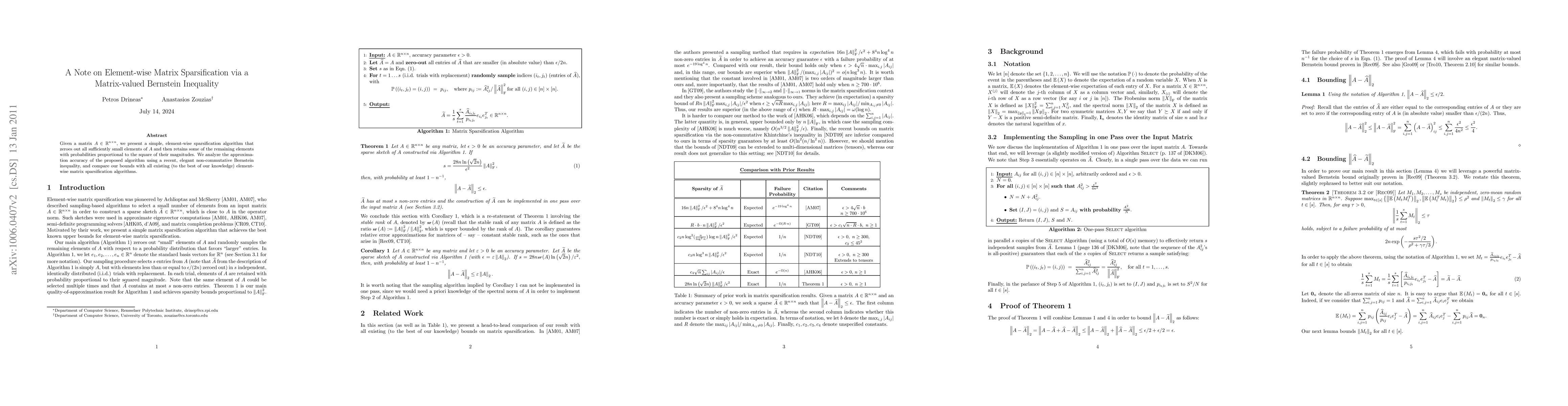 This paper proposes an element-wise matrix sparsification algorithm that zeroes out small elements and retains others based on their magnitude squared. The algorithm's accuracy is analyzed using a new matrix-valued Bernstein inequality, and its performance is compared favorably against existing methods.