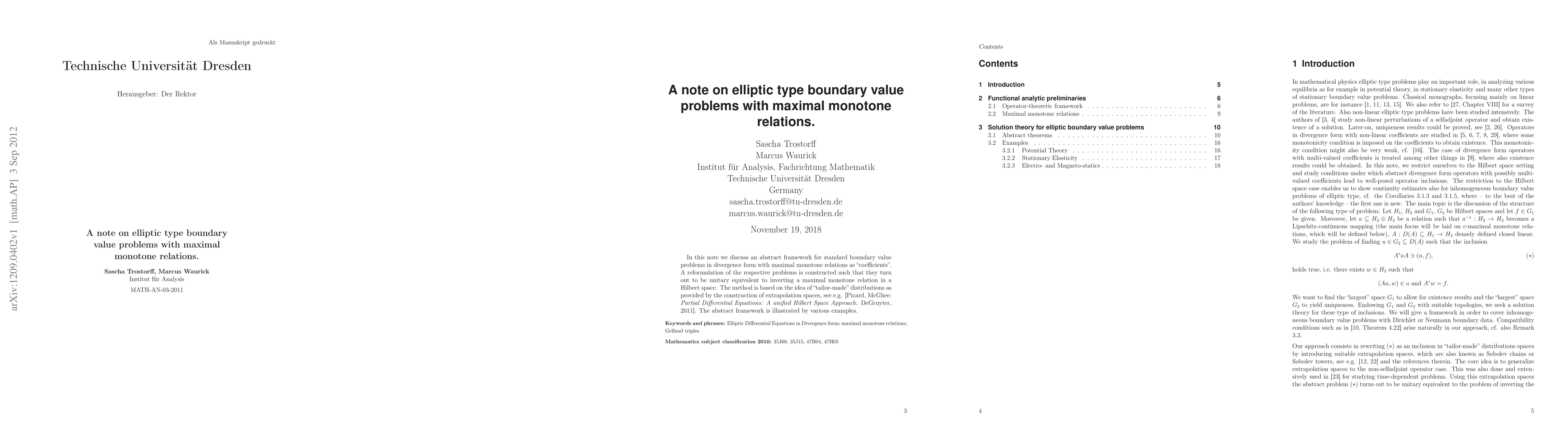 This paper presents an abstract framework for elliptic boundary value problems with maximal monotone relations, reformulating them as unitary equivalent to inverting a maximal monotone relation in a Hilbert space using "tailor-made" distributions from extrapolation spaces. Examples are provided to illustrate the method.