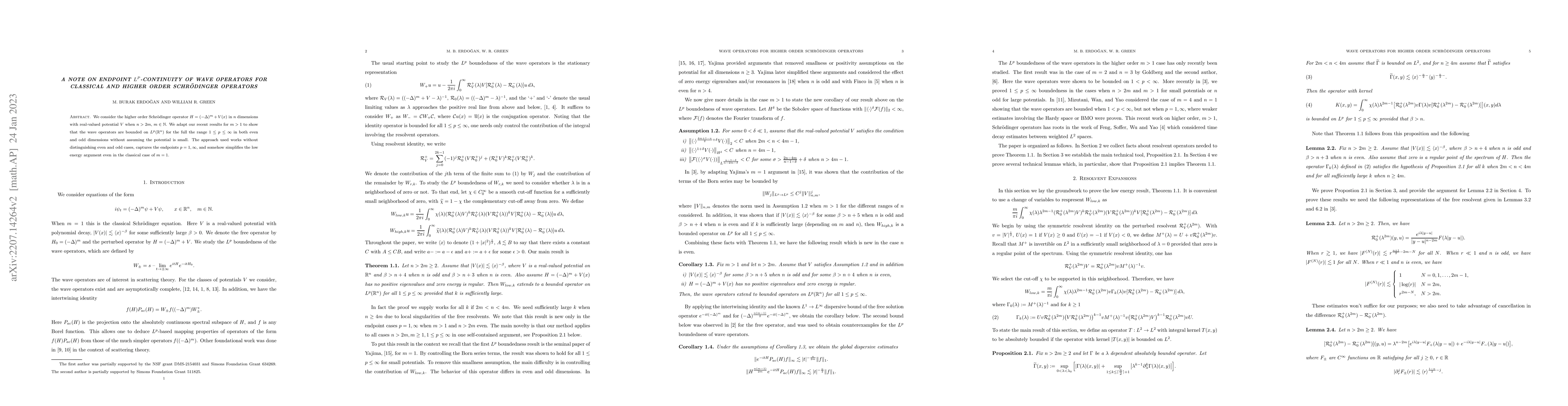 This paper demonstrates $L^p$-continuity for wave operators of higher order Schrödinger operators $H=(-\Delta)^m+V(x)$ in $n$ dimensions, showing boundedness on $L^p(\mathbb R^n)$ for $1\leq p\leq \infty$ without requiring a small potential, and simplifies the low energy argument even for $m=1$.