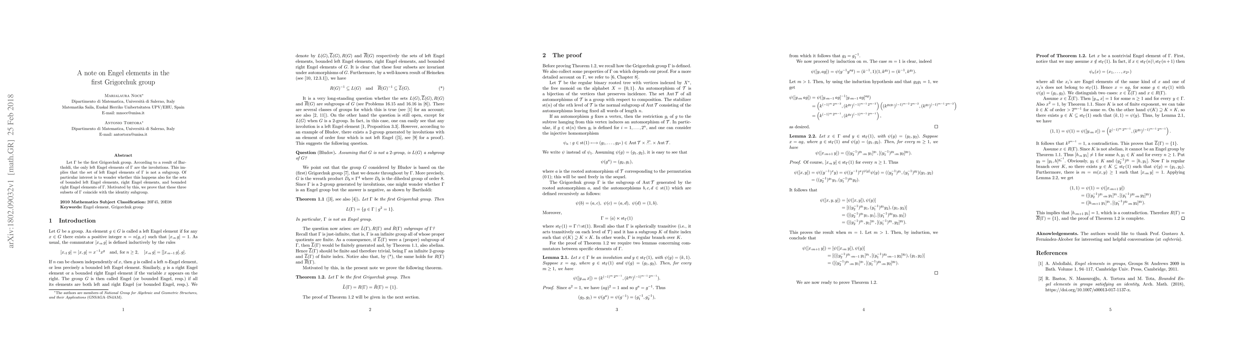 This research examines Engel elements in the first Grigorchuk group $\Gamma$, showing that the only left Engel elements are involutions. It concludes that the sets of bounded left Engel elements, right Engel elements, and bounded right Engel elements all coincide with the identity subgroup.