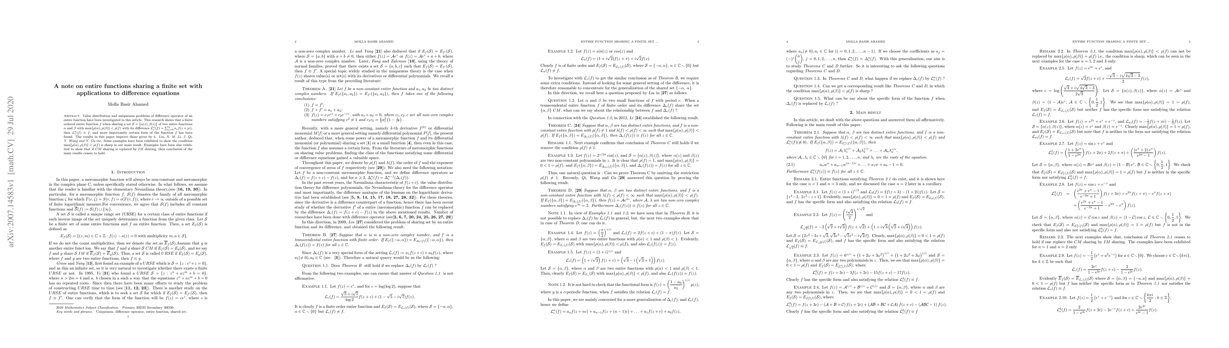 Value distribution and uniqueness problems of difference operator of an entire function have been investigated in this article. This research shows that a finite ordered entire function $ f $ when sharing a set $ \mathcal{S}=\{\alpha(z), \beta(z)\} $ of two entire functions $ \alpha $ and $ \beta $ with $ \max\{\rho(\alpha), \rho(\beta)\}<\rho(f) $ with its difference $ \mathcal{L}^n_c(f)=\sum_{j=0}^{n}a_jf(z+jc) $, then $ \mathcal{L}^n_c(f)\equiv f $, and more importantly certain form of the function $ f $ has been found. The results in this paper improve those given by \emph{k. Liu}, \emph{X. M. Li}, \emph{J. Qi, Y. Wang and Y. Gu} etc. Some constructive examples have been exhibited to show the condition $ \max\{\rho(\alpha), \rho(\beta)\}<\rho(f) $ is sharp in our main result. Examples have been also exhibited to show that if $ CM $ sharing is replaced by $ IM $ sharing, then conclusion of the main results ceases to hold.