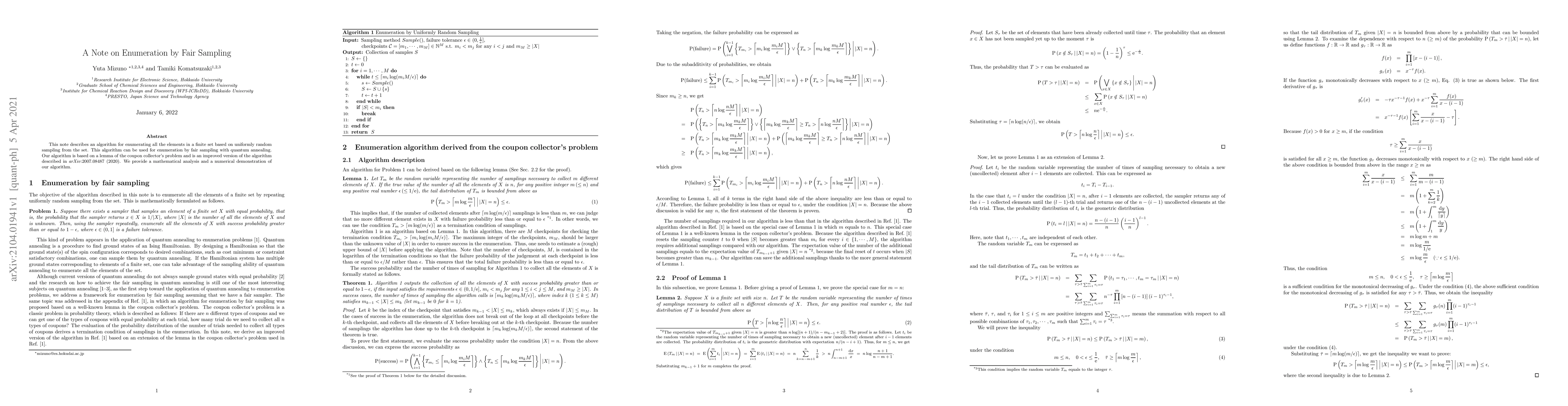 This paper presents an improved algorithm for enumerating all elements in a finite set through uniformly random sampling, leveraging quantum annealing. The method is grounded in a lemma from the coupon collector's problem and includes a mathematical analysis and numerical demonstration.