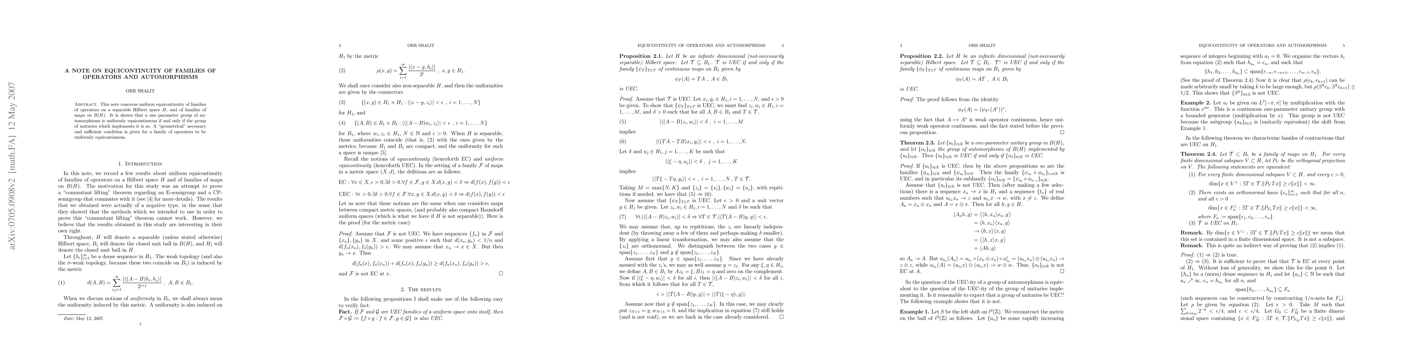 This note concerns uniform equicontinuity of families of operators on a separable Hilbert space H, and of families of maps on B(H). It is shown that a one parameter group of automorphisms is uniformly equicontinuous if and only if the group of unitaries which implements it is so. A "geometrical" necessary and sufficient condition is given for a family of operators to be uniformly equicontinuous.