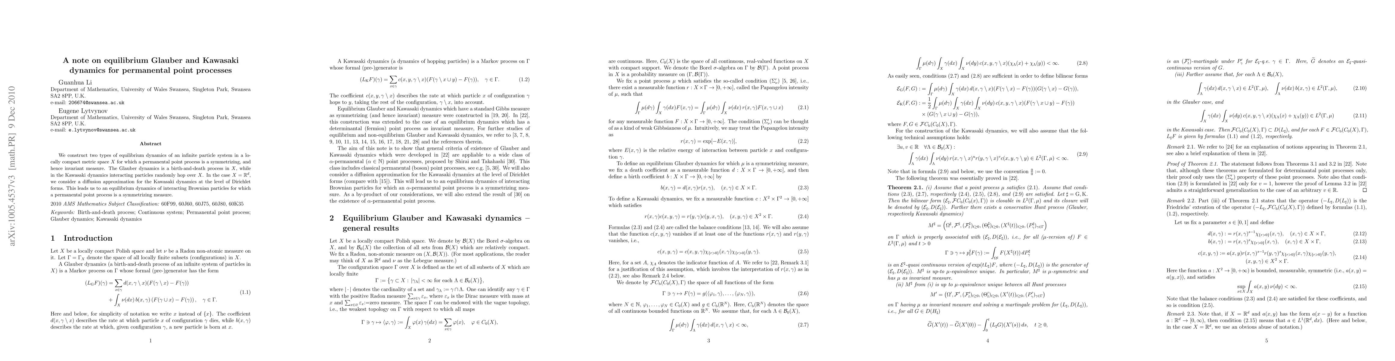 This paper constructs equilibrium dynamics for an infinite particle system in a locally compact metric space, focusing on Glauber and Kawasaki dynamics for permanental point processes. It explores a birth-and-death process and particle hopping, and provides a diffusion approximation for the Kawasaki dynamics in $\mathbb R^d$, leading to an equilibrium dynamics of interacting Brownian particles.