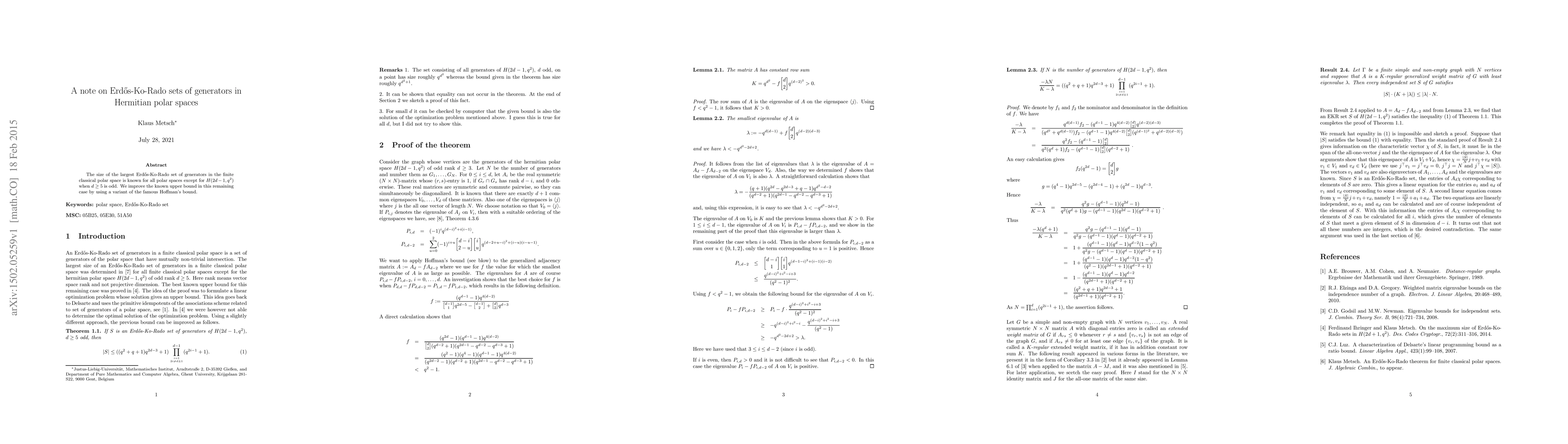 This paper improves the upper bound for the largest Erdős-Ko-Rado set of generators in the Hermitian polar space $H(2d-1,q^2)$ when $d\ge 5$ is odd, utilizing a variant of Hoffman's bound. The result fills a gap in the known sizes for these sets in finite classical polar spaces.