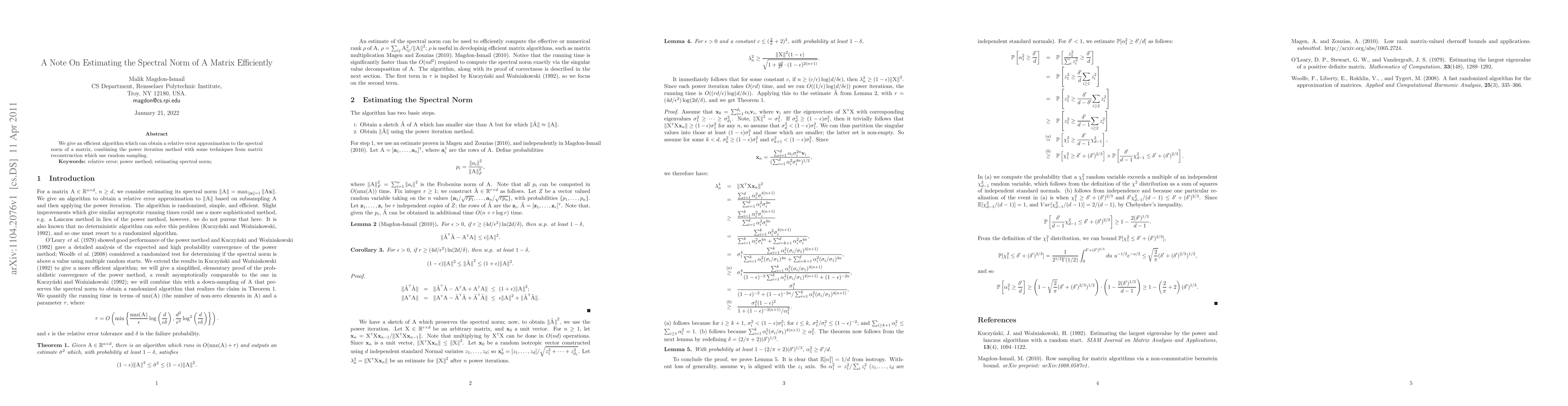 We give an efficient algorithm which can obtain a relative error approximation to the spectral norm of a matrix, combining the power iteration method with some techniques from matrix reconstruction which use random sampling.
