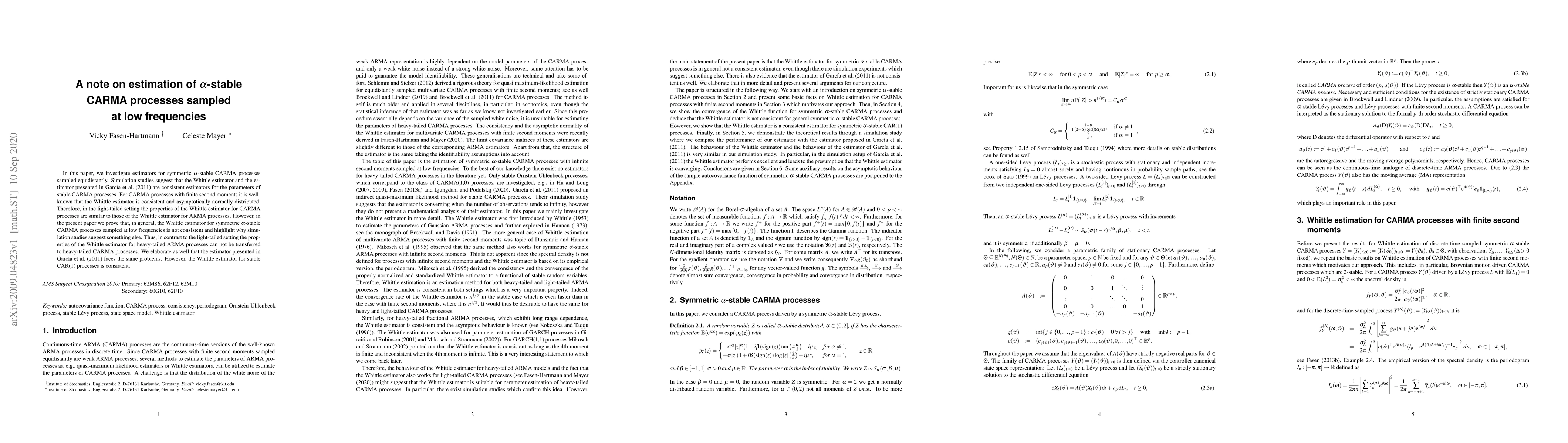 This paper examines estimators for symmetric $\alpha$-stable CARMA processes, finding that the Whittle estimator is not generally consistent for low-frequency sampled processes, unlike in light-tailed settings. The estimator from García et al. (2011) also faces similar issues, except for stable CAR(1) processes, which remain consistent.