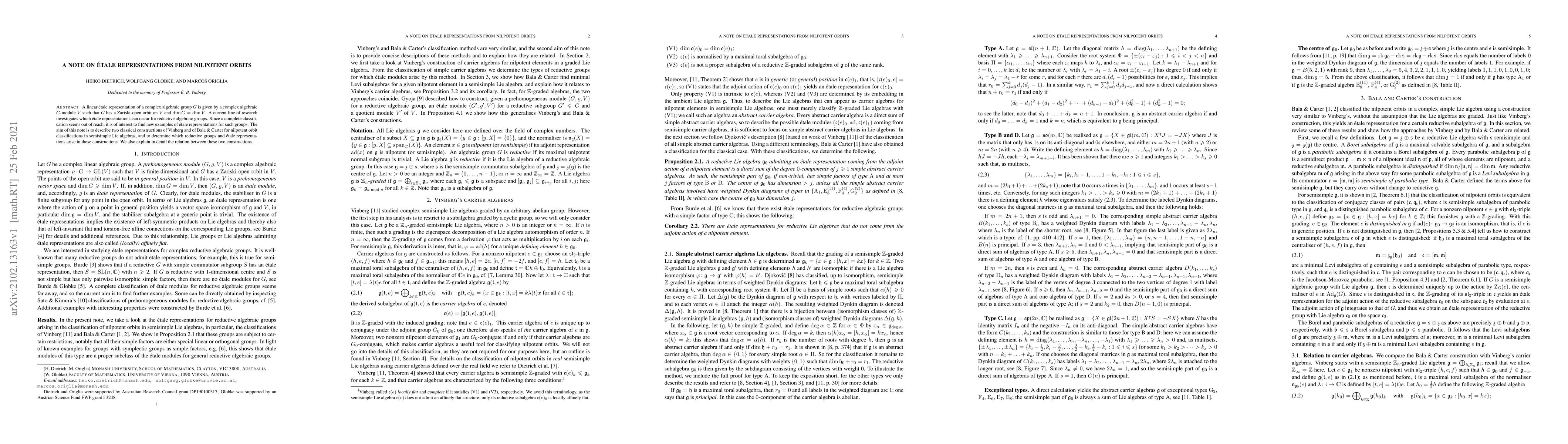 A linear \'etale representation of a complex algebraic group $G$ is given by a complex algebraic $G$-module $V$ such that $G$ has a Zariski-open orbit on $V$ and $\dim G=\dim V$. A current line of research investigates which \'etale representations can occur for reductive algebraic groups. Since a complete classification seems out of reach, it is of interest to find new examples of \'etale representations for such groups. The aim of this note is to describe two classical constructions of Vinberg and of Bala & Carter for nilpotent orbit classifications in semisimple Lie algebras, and to determine which reductive groups and \'etale representations arise in these constructions. We also explain in detail the relation between these two~constructions.