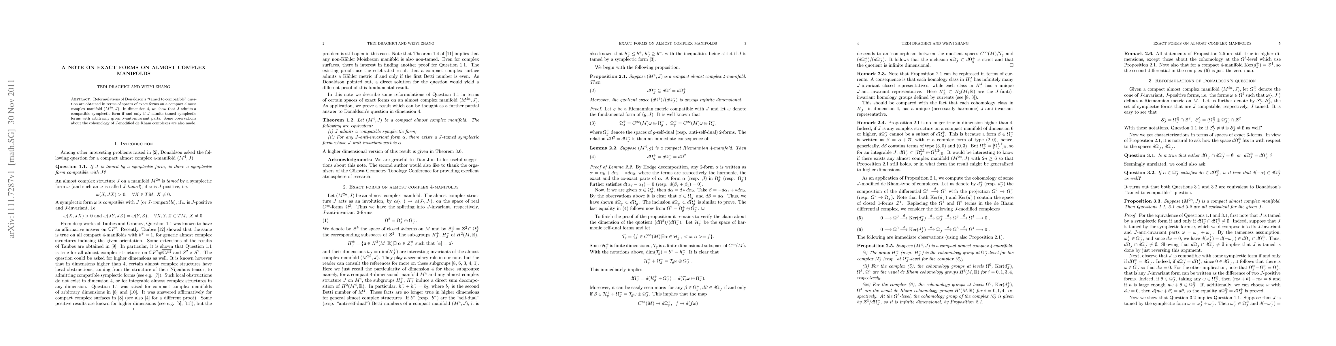 Reformulations of Donaldson's "tamed to compatible" question are obtained in terms of spaces of exact forms on a compact almost complex manifold $(M^{2n},J)$. In dimension 4, we show that $J$ admits a compatible symplectic form if and only if $J$ admits tamed symplectic forms with arbitrarily given $J$-anti-invariant parts. Some observations about the cohomology of $J$-modified de Rham complexes are also made.