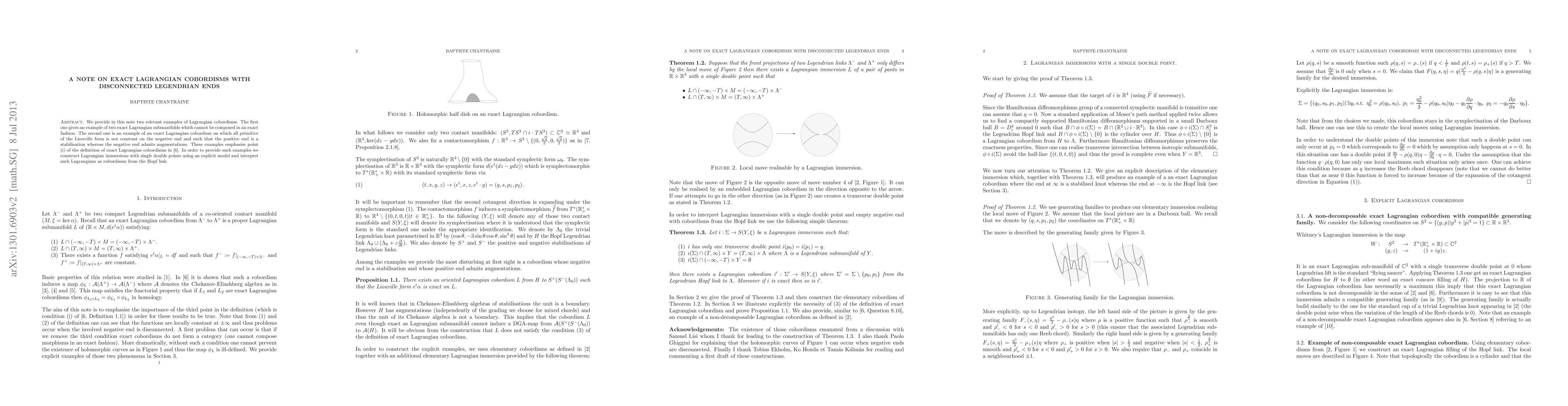 This paper presents two examples of exact Lagrangian cobordisms with disconnected Legendrian ends, illustrating cases where exact composition is impossible and where the Liouville form's primitive is non-constant. It constructs these examples using Lagrangian immersions with single double points and interprets them as cobordisms from the Hopf link.