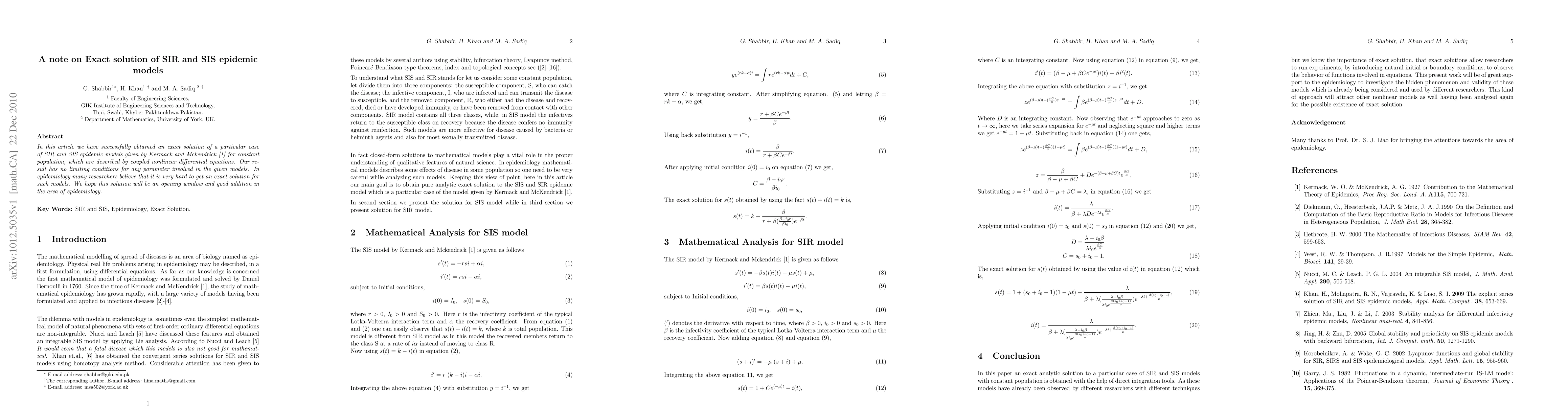 In this article we have successfully obtained an exact solution of a particular case of SIR and SIS epidemic models given by Kermack and Mckendrick [1] for constant population, which are described by coupled nonlinear differential equations. Our result has no limiting conditions for any parameter involved in the given models. In epidemiology many researchers believe that it is very hard to get an exact solution for such models. We hope this solution will be an opening window and good addition in the area of epidemiology.