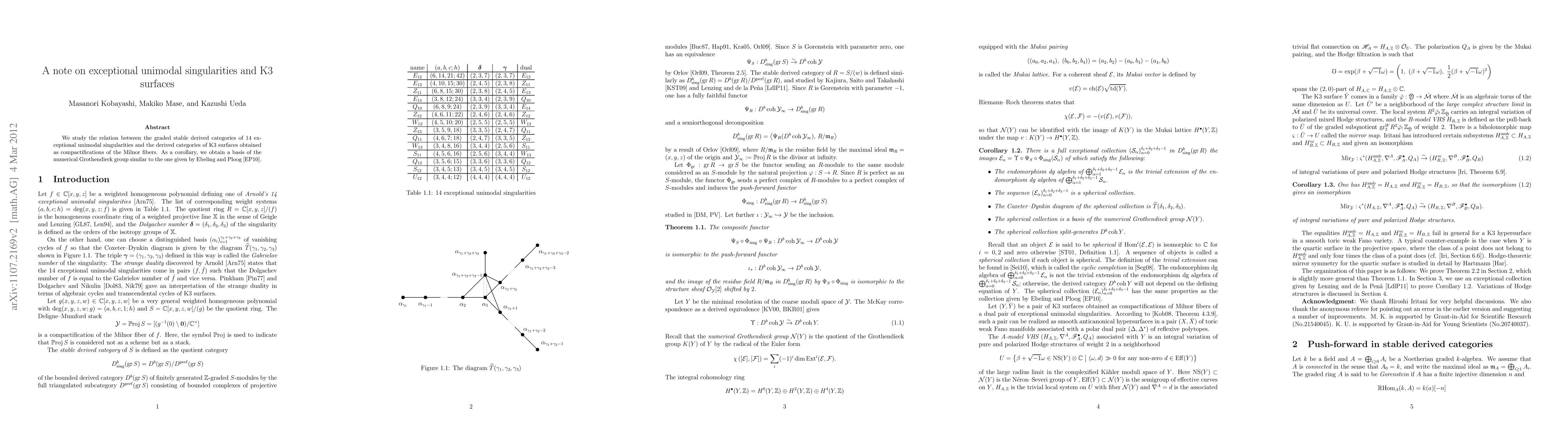 This research explores the connection between the derived categories of 14 exceptional unimodal singularities and K3 surfaces formed via Milnor fiber compactifications, establishing a basis for the numerical Grothendieck group analogous to Ebeling and Ploog's work.