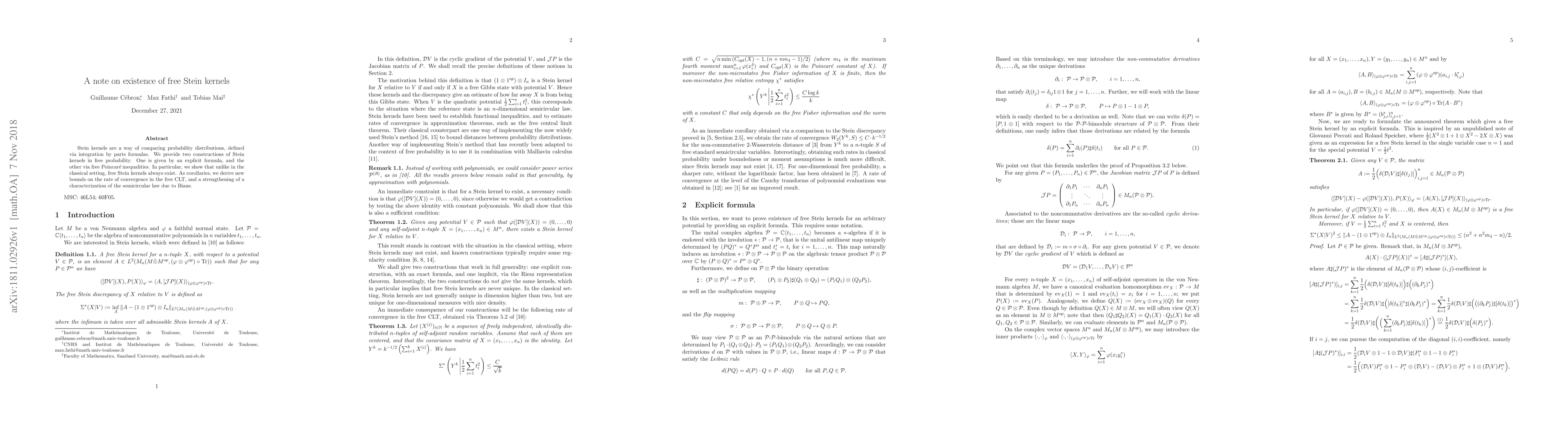 Two-line summary: This paper explores the existence of free Stein kernels, which are used to compare probability distributions via integration by parts formulas. It constructs two types of free Stein kernels, proving their existence in free probability and deriving new bounds on convergence rates in the free central limit theorem, along with a strengthened characterization of the semicircular law.