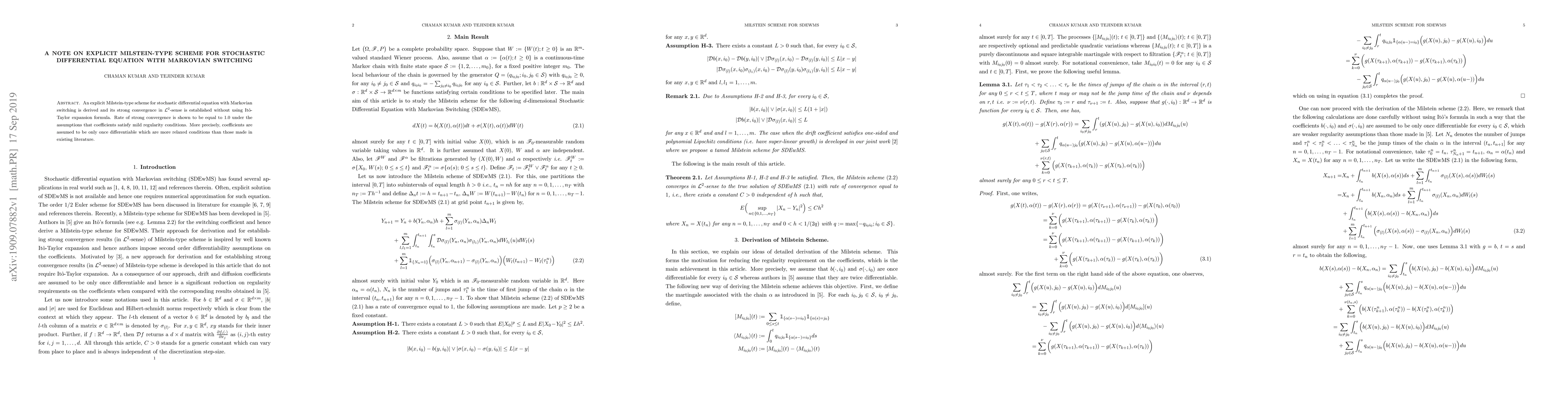 This paper derives an explicit Milstein-type scheme for stochastic differential equations with Markovian switching, establishing its strong convergence in $\mathcal{L}^2$-sense at a rate of 1.0, under the relaxed assumption that coefficients are only once differentiable.