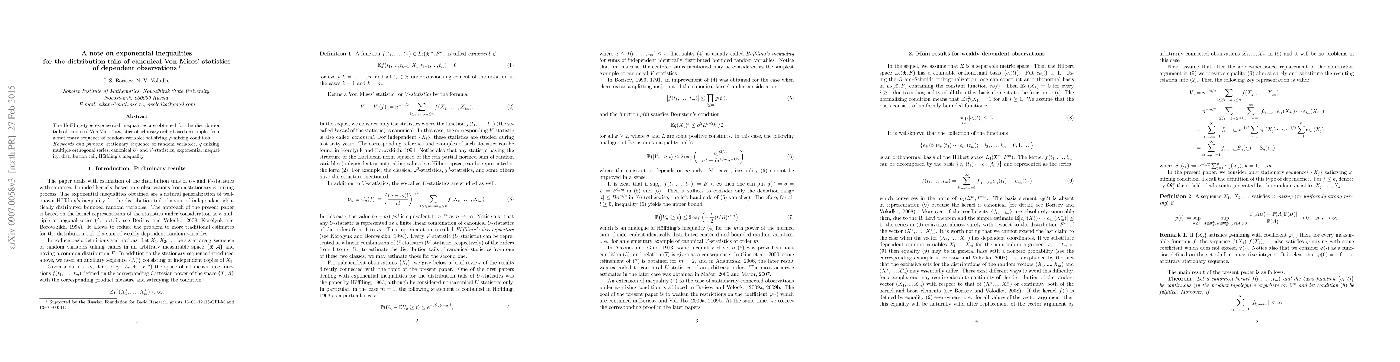 Hoeffding-type exponential inequalities are obtained for the distribution tails of canonical von Mises' statistics of arbitrary order based on samples from a stationary sequence of random variables satisfying the {\varphi}-mixing condition. The present paper weakens the restrictions on the coefficient {\varphi}() which are contained in the paper "Exponential inequalities for the distributions of canonical U- and V-statistics of dependent observations" by Borisov and Volodko (2009). At the same time, we correct the corresponding proof in this paper.