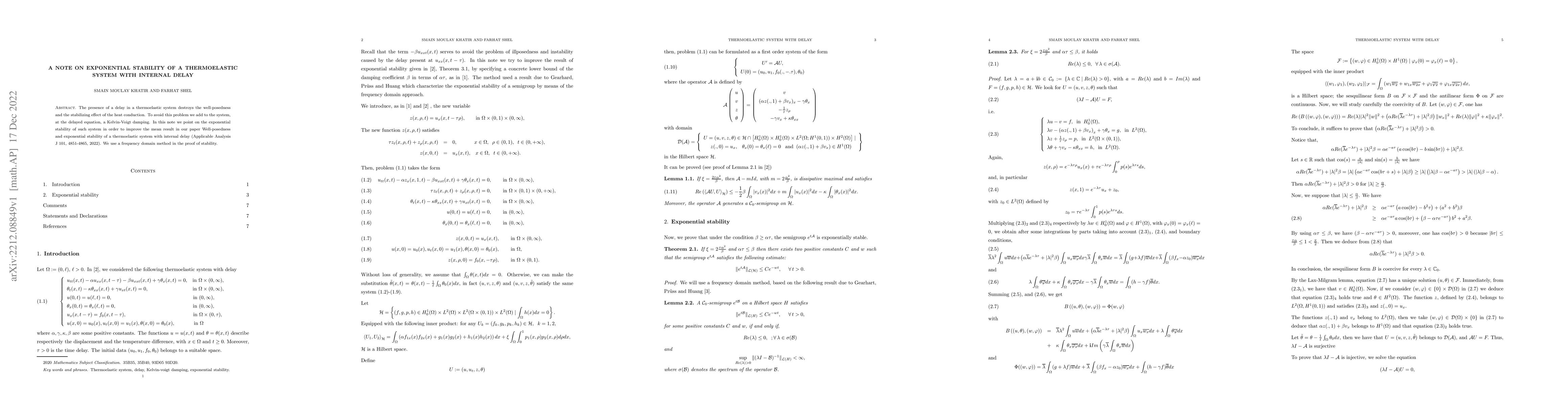 The presence of a delay in a thermoelastic system destroys the well-posedness and the stabilizing effect of the heat conduction. To avoid this problem we add to the system, at the delayed equation, a Kelvin-Voigt damping. In this note we point on the exponential stability of such system in order to improve the mean result in our paper Well-posedness and exponential stability of a thermoelastic system with internal delay (Applicable Analysis J 101, 4851-4865, 2022). We use a frequency domain method in the proof of stability.