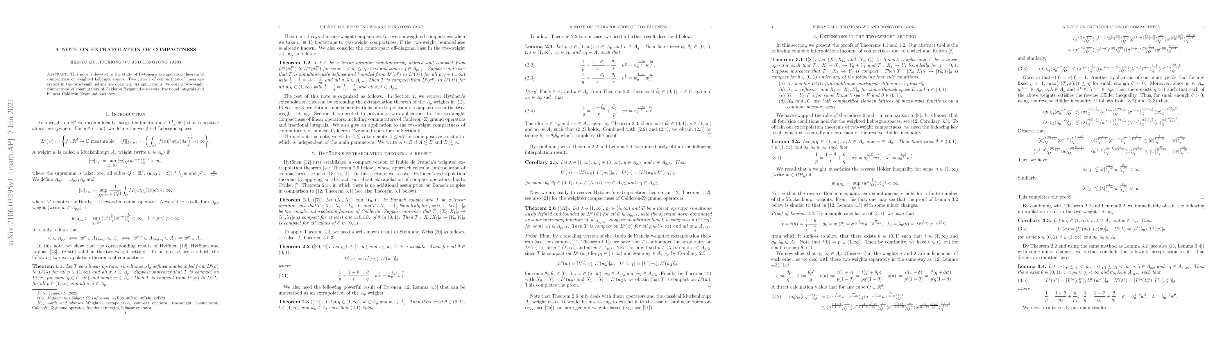 This paper explores Hytönen's extrapolation theorem for compactness in weighted Lebesgue spaces, deriving two criteria for compactness of linear operators. It applies these criteria to establish two-weight compactness for commutators, fractional integrals, and bilinear Calderón-Zygmund operators.