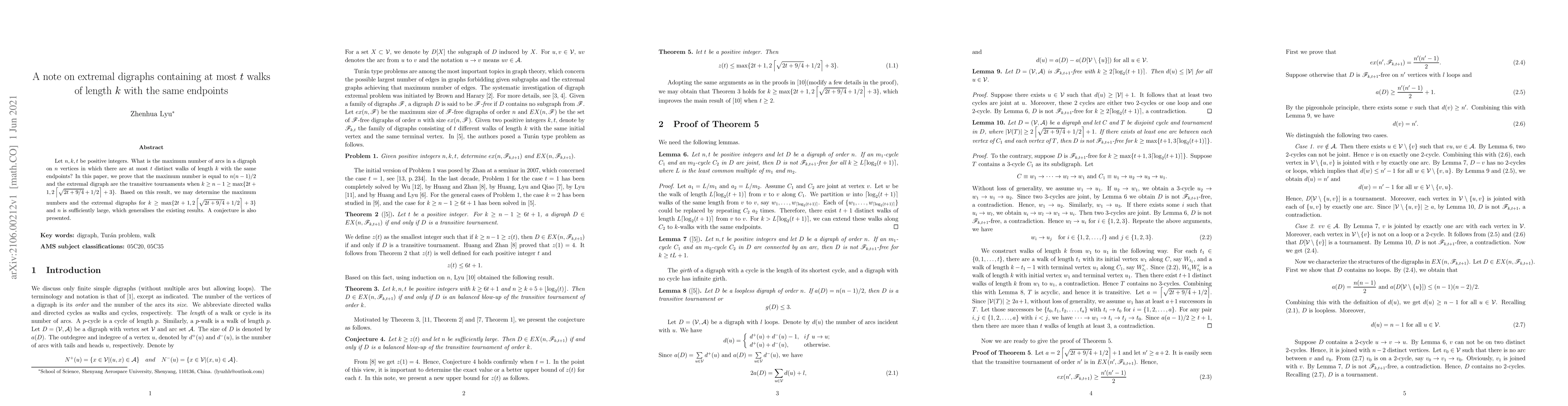 The research paper proves that the maximum number of arcs in a digraph with at most $t$ walks of length $k$ is $n(n-1)/2$, where $n$ is the number of vertices. The extremal digraphs for large $n$ are transitive tournaments when $k gtr n-1 gt ext{certain values}$.