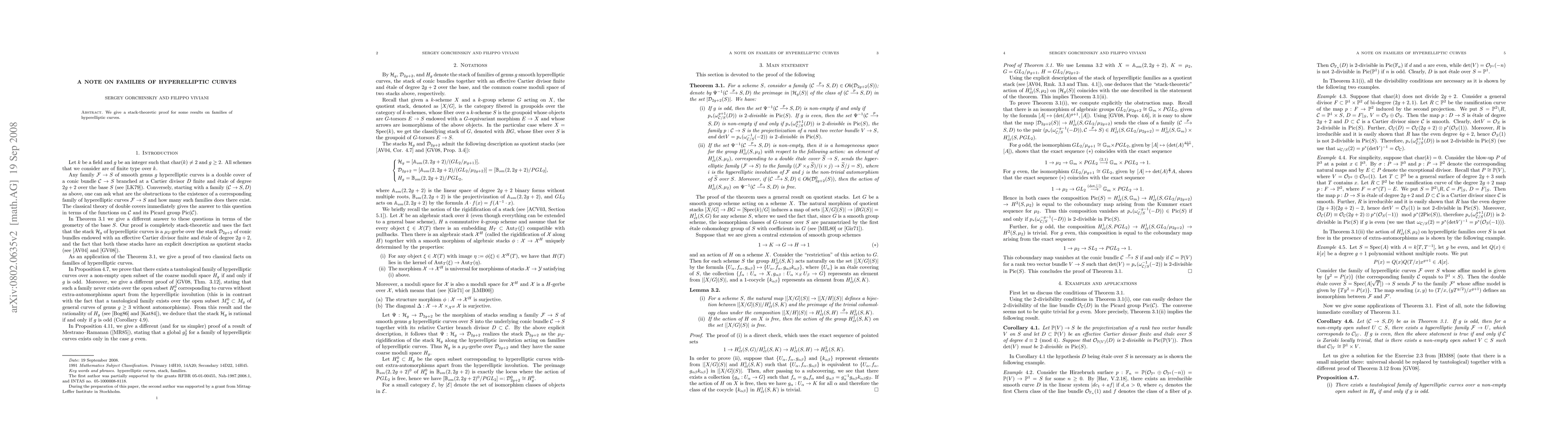 Summary: This paper presents a stack-theoretic proof for certain results concerning families of hyperelliptic curves, utilizing advanced mathematical frameworks to enhance the understanding of these geometric objects. The approach provides a novel perspective on the study of hyperelliptic curves.