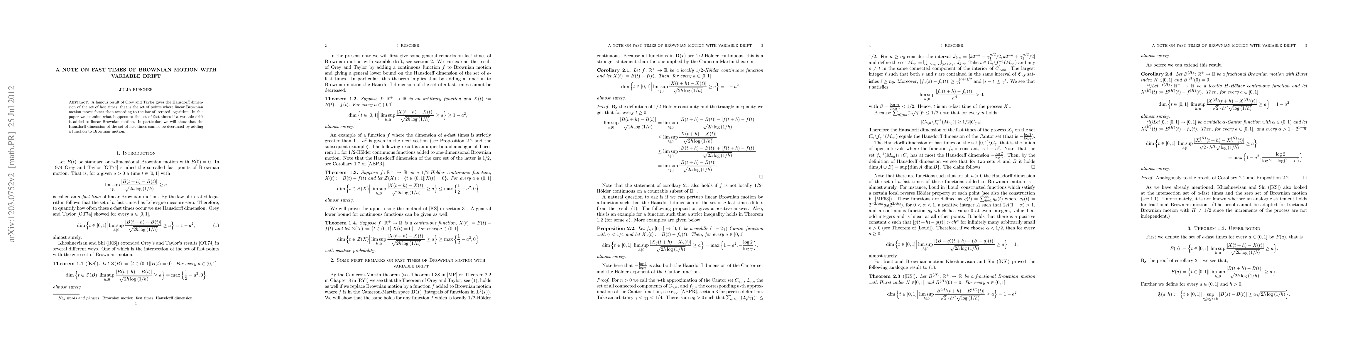 The paper examines the set of fast times for Brownian motion with variable drift, utilizing stochastic analysis and measure theory to derive results on Hausdorff dimension.