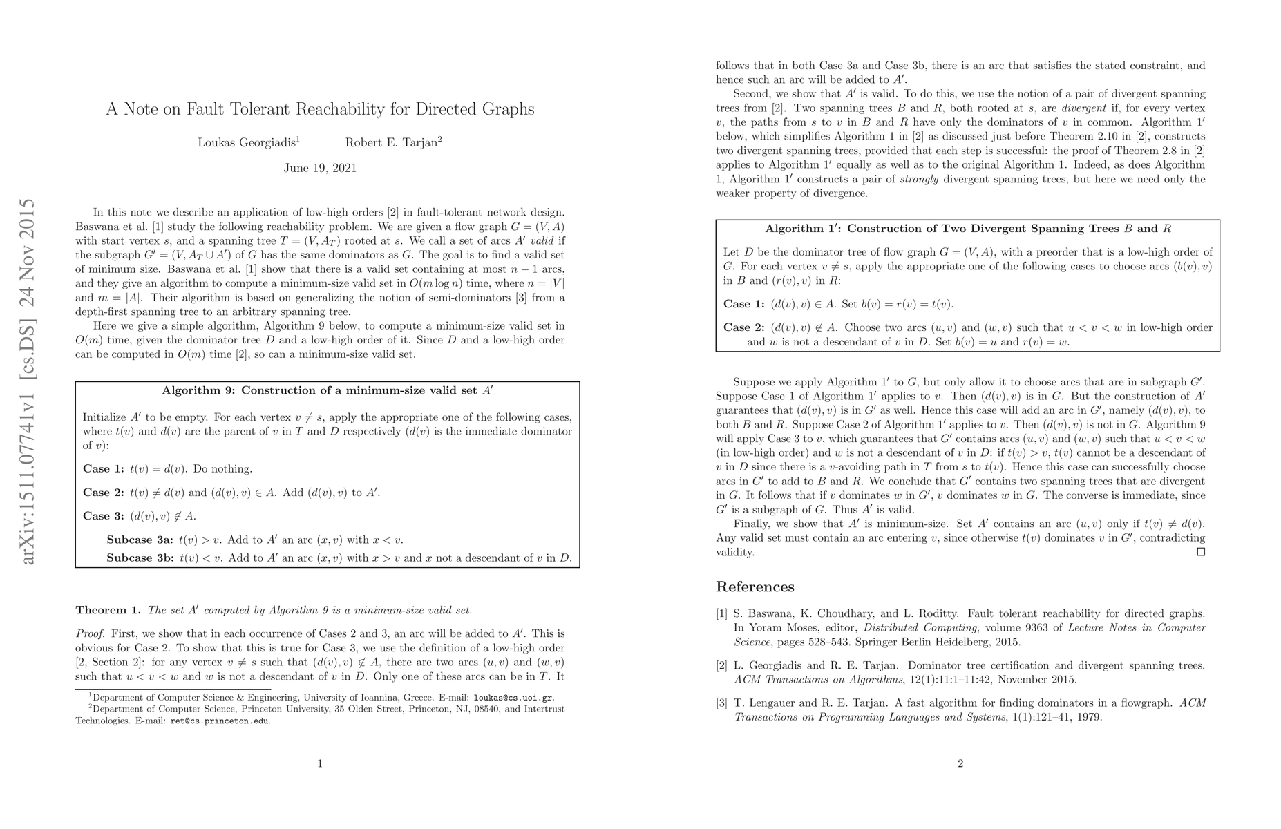 In this note we describe an application of low-high orders in fault-tolerant network design. Baswana et al. [DISC 2015] study the following reachability problem. We are given a flow graph $G = (V, A)$ with start vertex $s$, and a spanning tree $T =(V, A_T)$ rooted at $s$. We call a set of arcs $A'$ valid if the subgraph $G' = (V, A_T \cup A')$ of $G$ has the same dominators as $G$. The goal is to find a valid set of minimum size. Baswana et al. gave an $O(m \log{n})$-time algorithm to compute a minimum-size valid set in $O(m \log{n})$ time, where $n = |V|$ and $m = |A|$. Here we provide a simple $O(m)$-time algorithm that uses the dominator tree $D$ of $G$ and a low-high order of it.