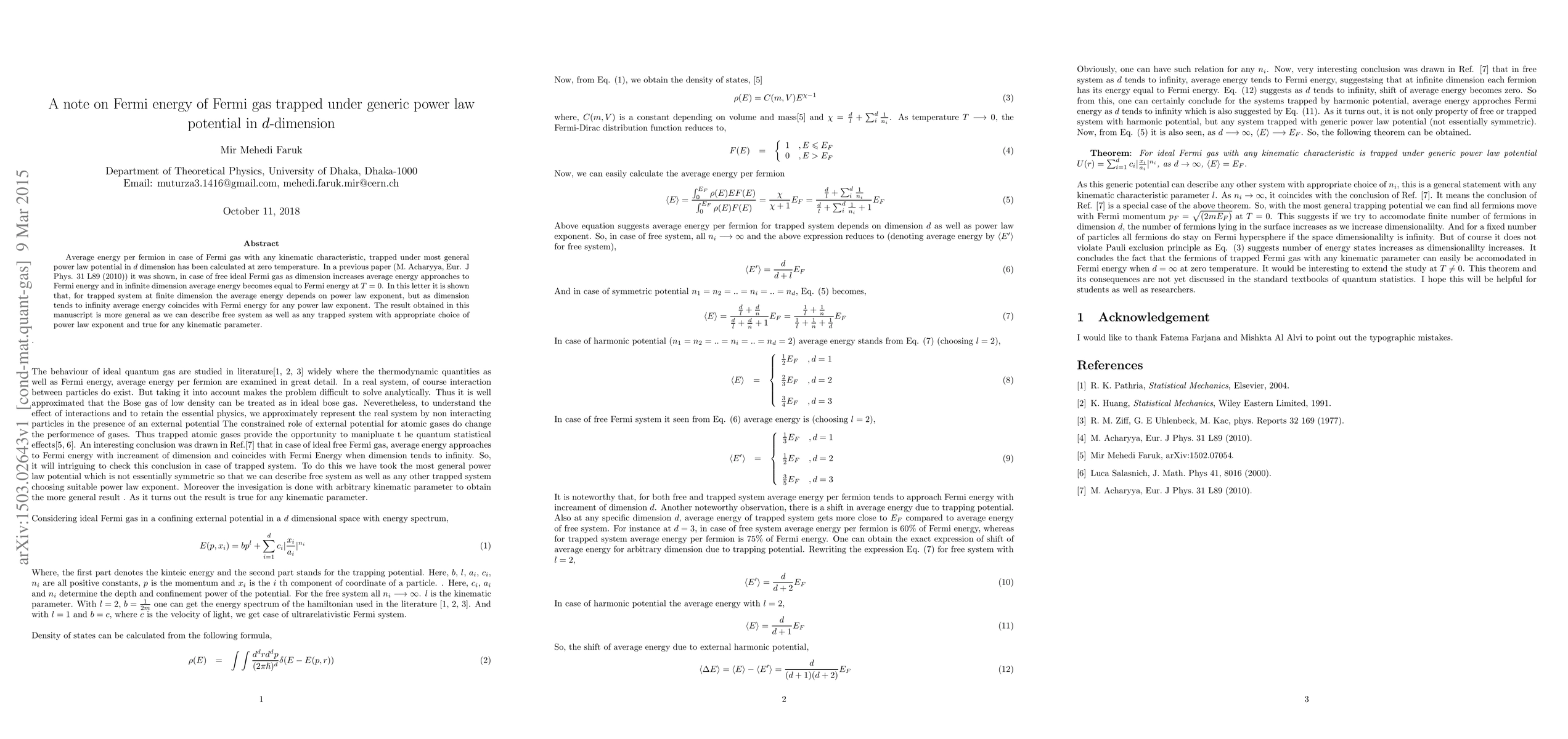 Average energy per fermion in case of Fermi gas with any kinematic characteristic, trapped under most general power law potential in $d$ dimension has been calculated at zero temperature. In a previous paper (M. Acharyya, Eur. J Phys. 31 L89 (2010)) it was shown, in case of free ideal Fermi gas as dimension increases average energy approaches to Fermi energy and in infinite dimension average energy becomes equal to Fermi energy at $T=0$. In this letter it is shown that, for trapped system at finite dimension the average energy depends on power law exponent, but as dimension tends to infinity average energy coincides with Fermi energy for any power law exponent. The result obtained in this manuscript is more general as we can describe free system as well as any trapped system with appropriate choice of power law exponent and true for any kinematic parameter.