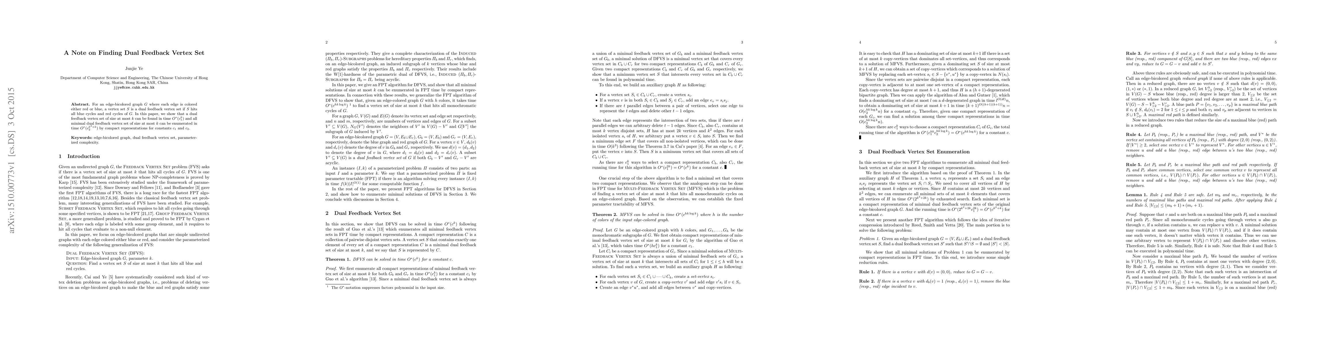For an edge-bicolored graph $G$ where each edge is colored either red or blue, a vertex set $S$ is a dual feedback vertex set if $S$ hits all blue cycles and red cycles of $G$. In this paper, we show that a dual feedback vertex set of size at most $k$ can be found in time $O^*(c_1^k)$ and all minimal dual feedback vertex set of size at most $k$ can be enumerated in time $O^*(c_2^{k^2 + k})$ by compact representations for constants $c_1$ and $c_2$.
