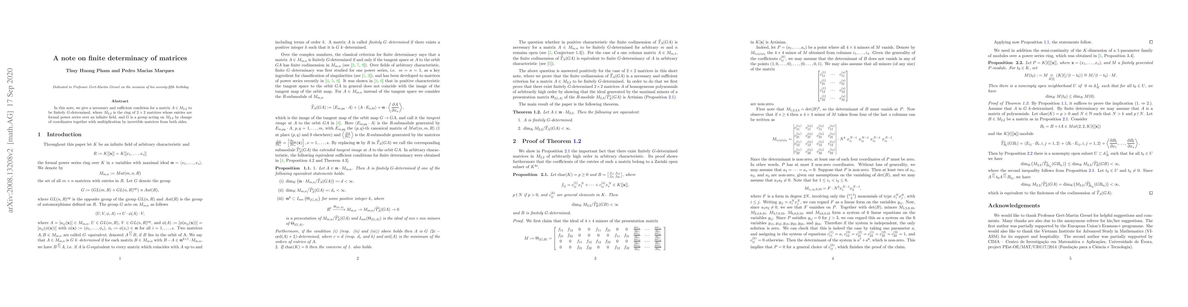 In this note, we give a necessary and sufficient condition for a matrix A in M to be finitely G-determined, where M is the ring of 2 x 2 matrices whose entries are formal power series over an infinite field, and G is a group acting on M by change of coordinates together with multiplication by invertible matrices from both sides.
