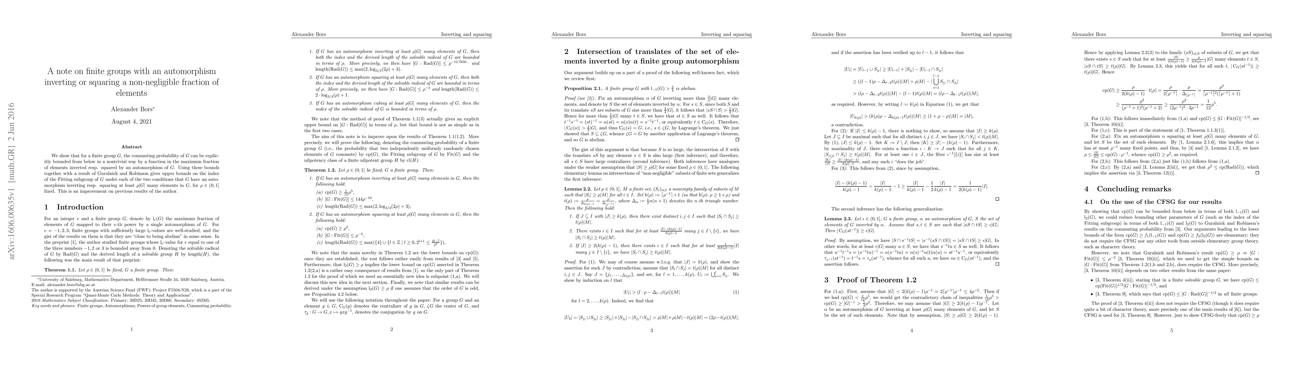 We show that for a finite group $G$, the commuting probability of $G$ can be explicitly bounded from below in a nontrivial way by a function in the maximum fraction of elements inverted resp. squared by an automorphism of $G$. Using these bounds together with a result of Guralnick and Robinson gives upper bounds on the index of the Fitting subgroup of $G$ under each of the two conditions that $G$ have an automorphism inverting resp. squaring at least $\rho|G|$ many elements in $G$, for $\rho\in\left(0,1\right]$ fixed. This is an improvement on previous results of the author.