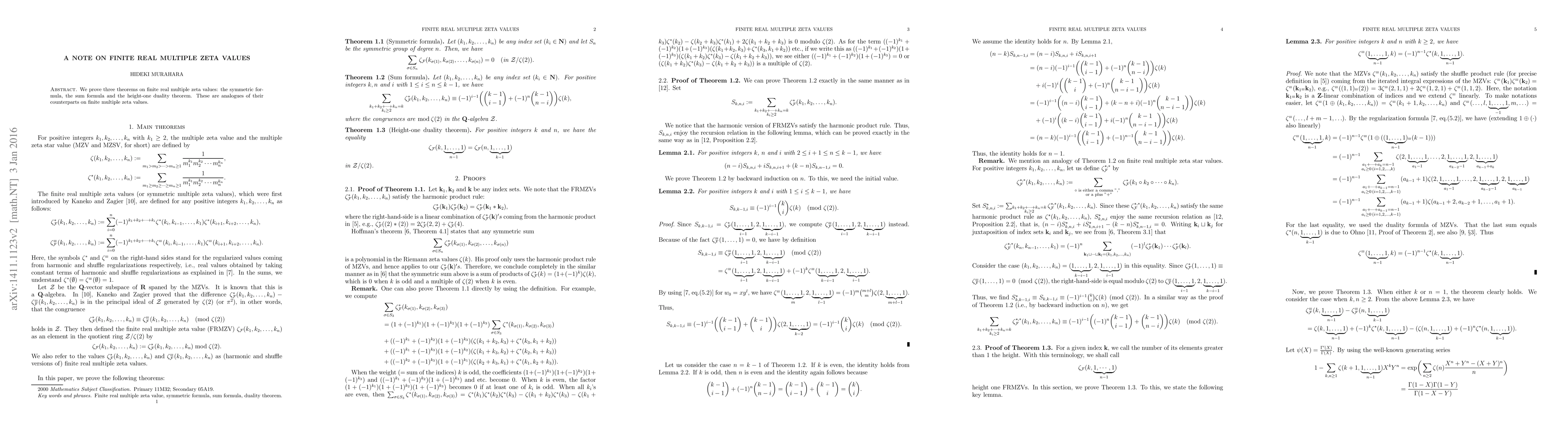 This paper proves three theorems regarding finite real multiple zeta values: the symmetric formula, the sum formula, and the height-one duality theorem, establishing their real analogues. These results extend previous findings on finite multiple zeta values to the real domain.